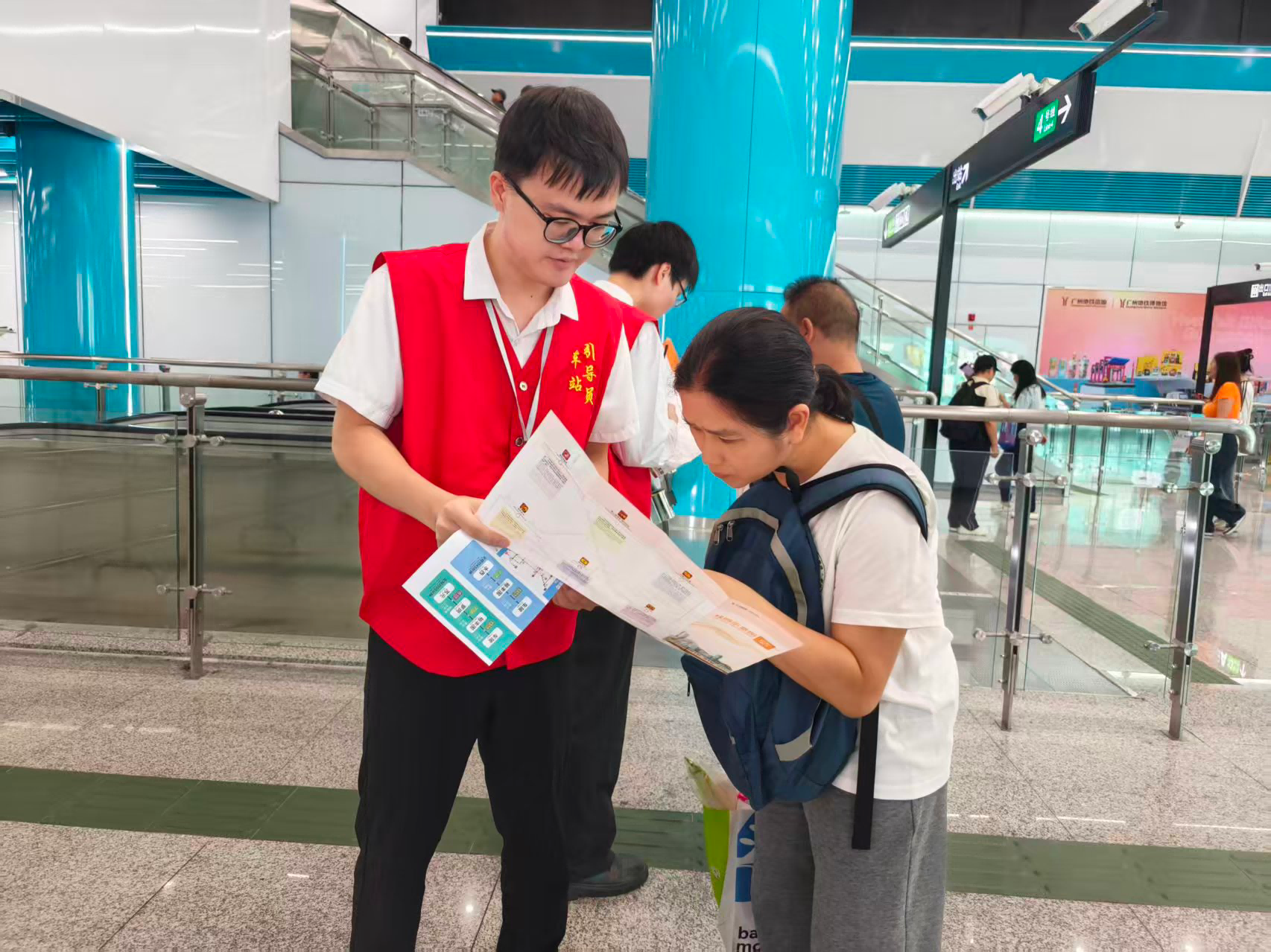9:45,广州地铁车陂站13号线,地铁志愿者、引导员详细解答乘客换乘4号线有关问题。