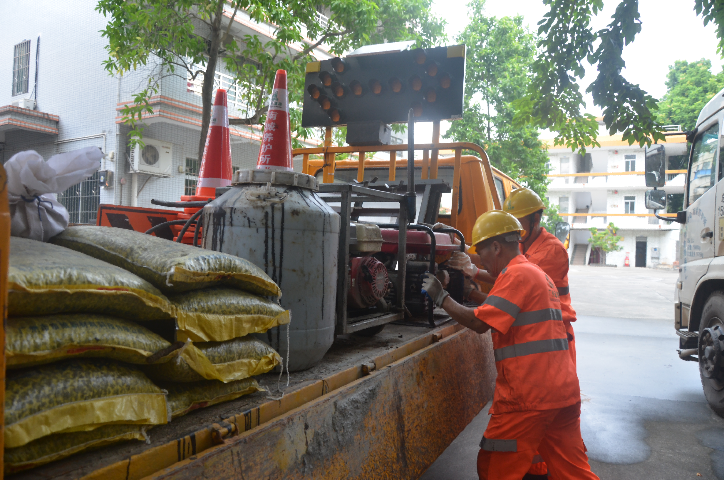 7:30,在钟村道班,广州市道路养护中心南城养护所值守人员将发电机、交通锥、警示标志、冷补料等应急物资有序搬运上车,仔细清点检查,确保物资装备处于良好状态,保障应急时能快速取用,以饱满状态做好应急值守准备,全力保障赛事期间道路通行安全。