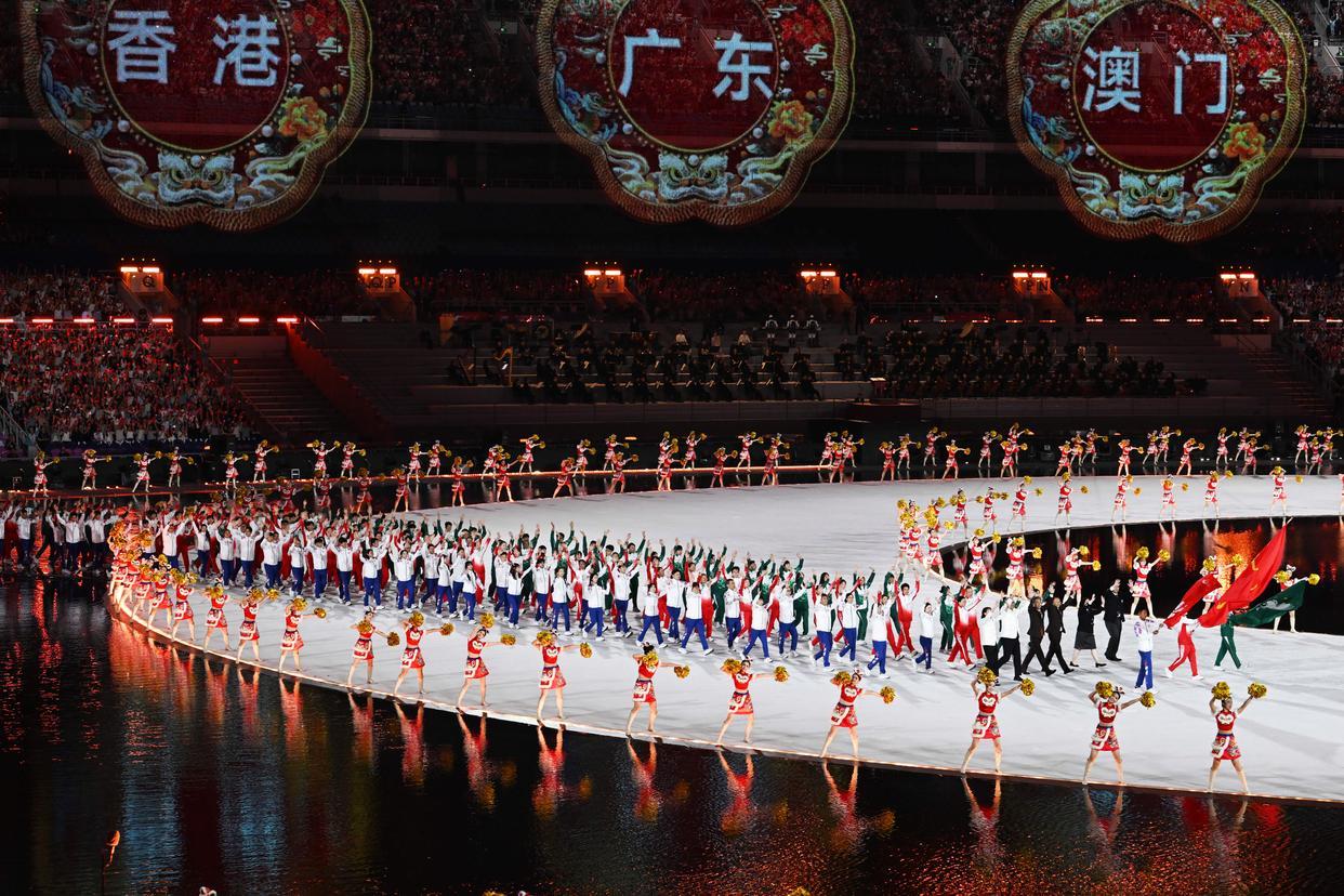 11月9日,广东省体育代表团、香港特别行政区体育代表团和澳门特别行政区体育代表团在入场仪式上共同入场。图源:新华社
