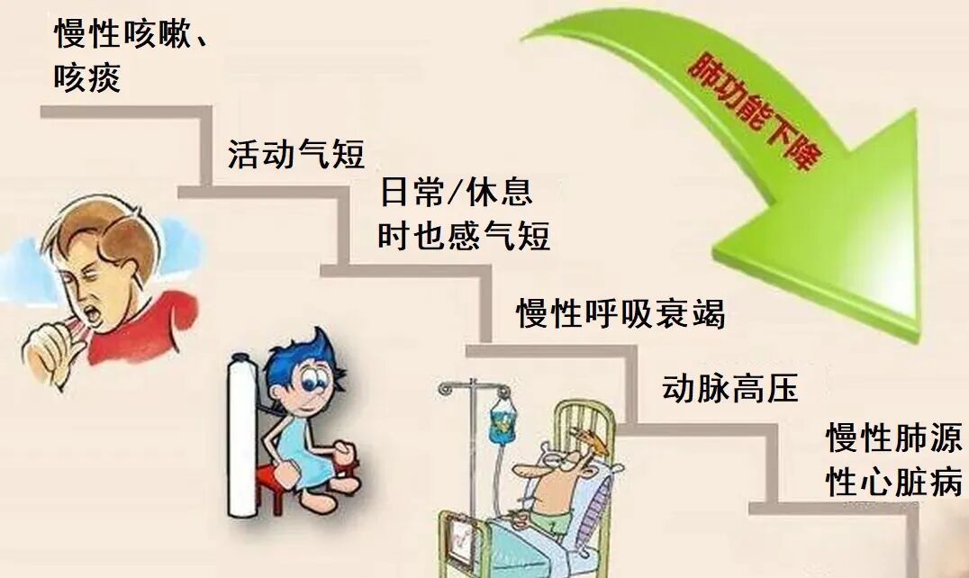 在疾病早期,有些患者并没有严重的呼吸困难,但是会有咳嗽、咳痰表现,往往由于没有影响到生活活动而被忽视,等到有明显呼吸困难、走路气喘,甚至需要急诊住院时,肺功能损伤就已经比较严重了。