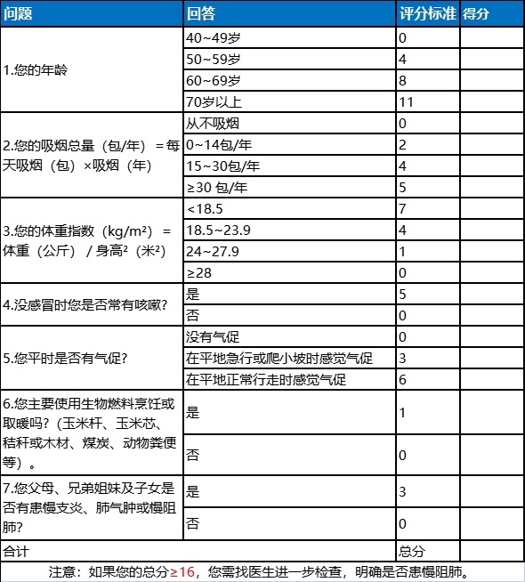 如果得分大于 16 分,就提示慢阻肺的可能性比较大,建议赶紧去医院做进一步检查。