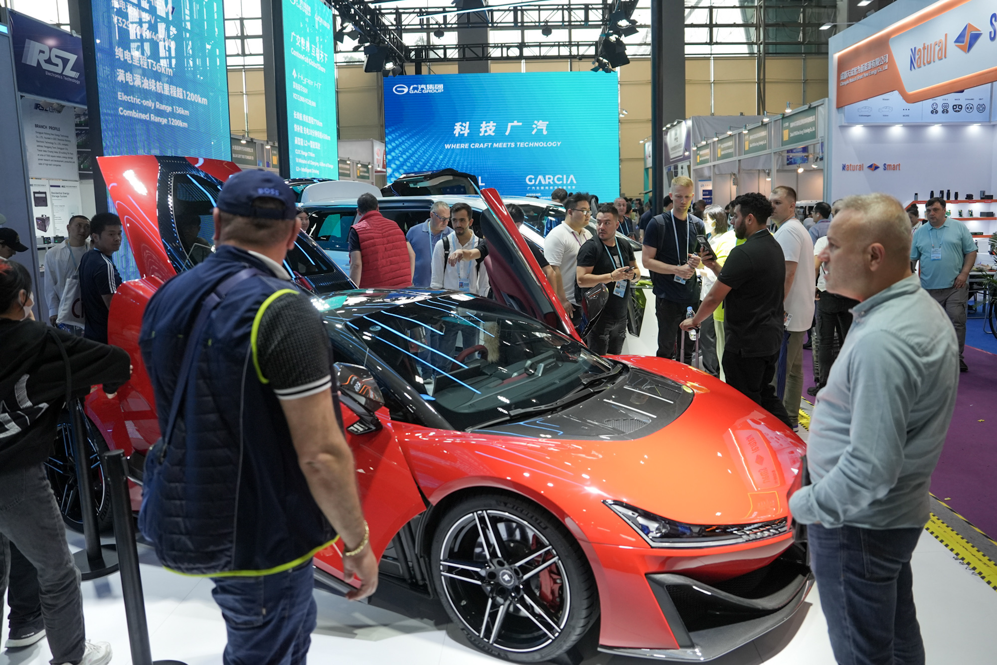 广交会新能源汽车及智慧出行展区,广汽展台上炫酷的汽车吸引了许多客商前来参观和咨询。