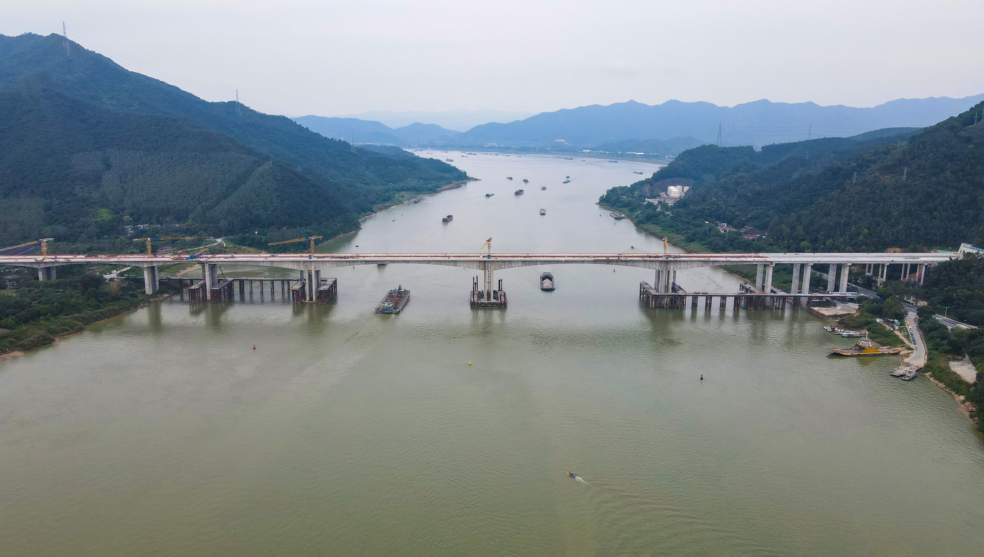 明高速公路杨梅西江特大桥实现双幅贯通,顺利联通西江南北两岸。通讯员供图。
