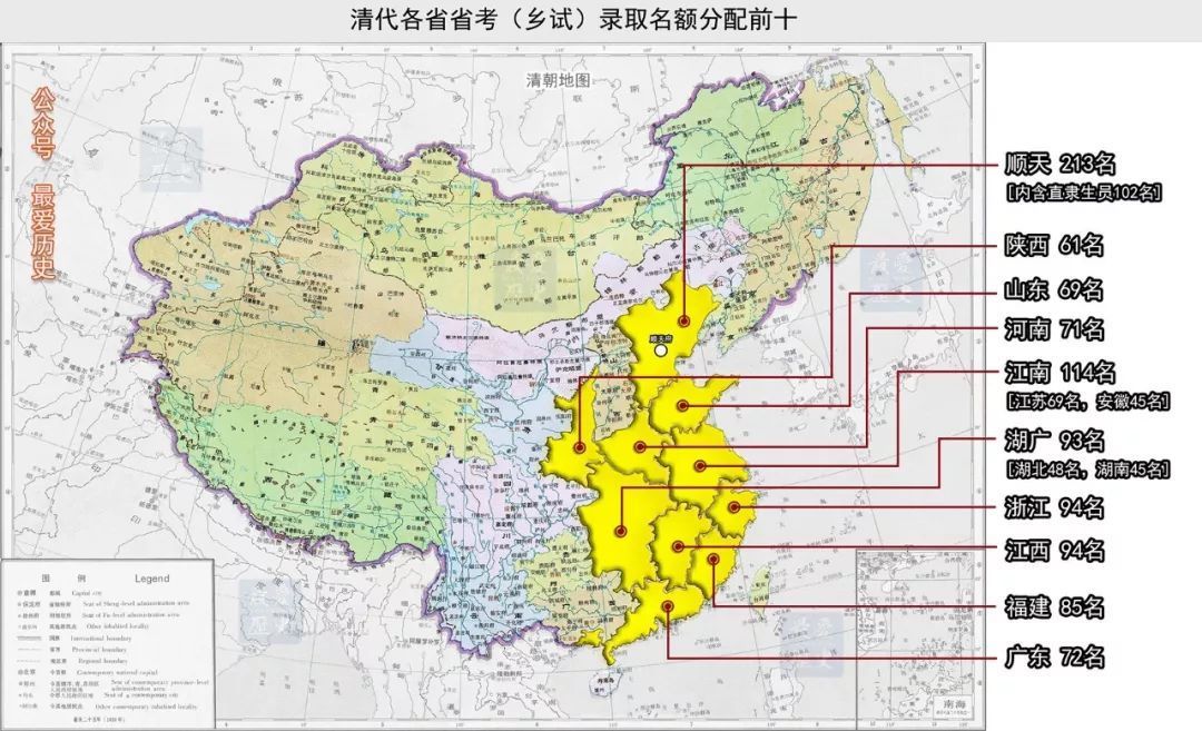 简单来说,就是按照每个省的大小、人口多寡,分配每个省的举人名额。比如,浙江、江西都分到了94名,以后这两个省每届录取举人就都是94人,再由这94人去参加国考(会试),按一定的比例录取进士。