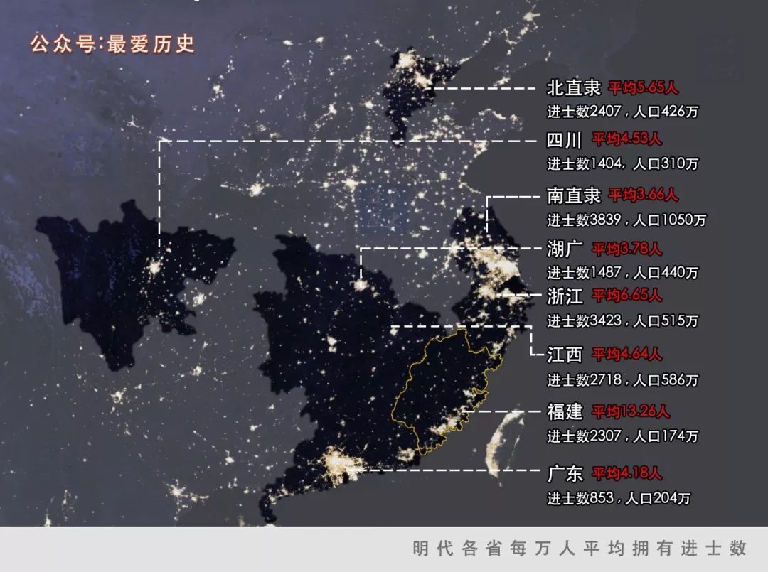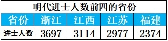综合下来,明代全部24800多名进士中,产生进士最多的三个省份是:浙江3697人,江西3114人,江苏2977人。