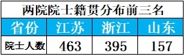 一项关于中国两院院士籍贯分布的统计显示,1955年至2017年间,江苏籍院士共463人,浙江籍院士共395人,远远高出其他省份(第三名,山东籍院士157人)。