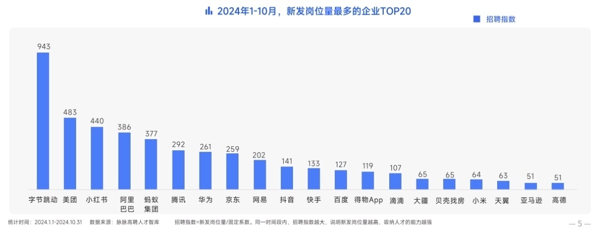 值得关注的是,新⼀线⼚商⼩红书年度新发岗位超过阿⾥巴巴、蚂蚁集团、腾讯等公司,位列第三。据悉,以上排名的数据来源均为脉脉高端人才智库。