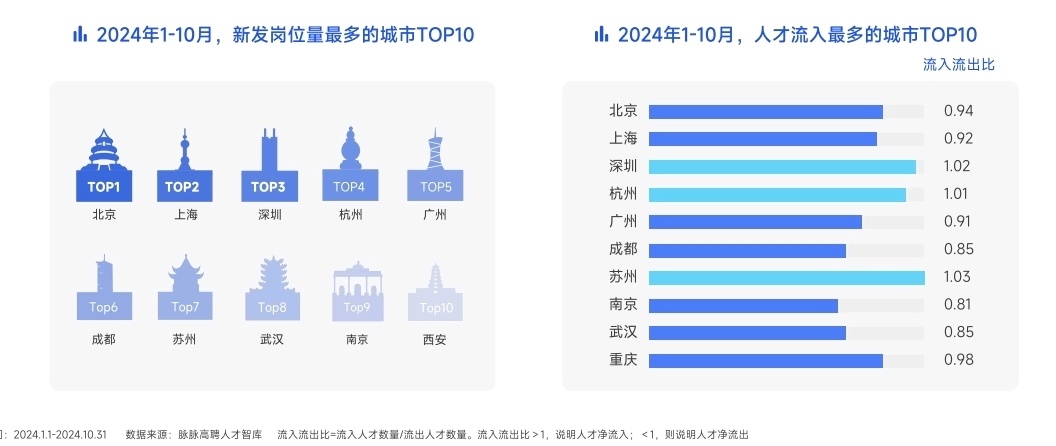 2024年1-10月,国内新发岗位最多的城市TOP10、人才流入最多的城市TOP10。
