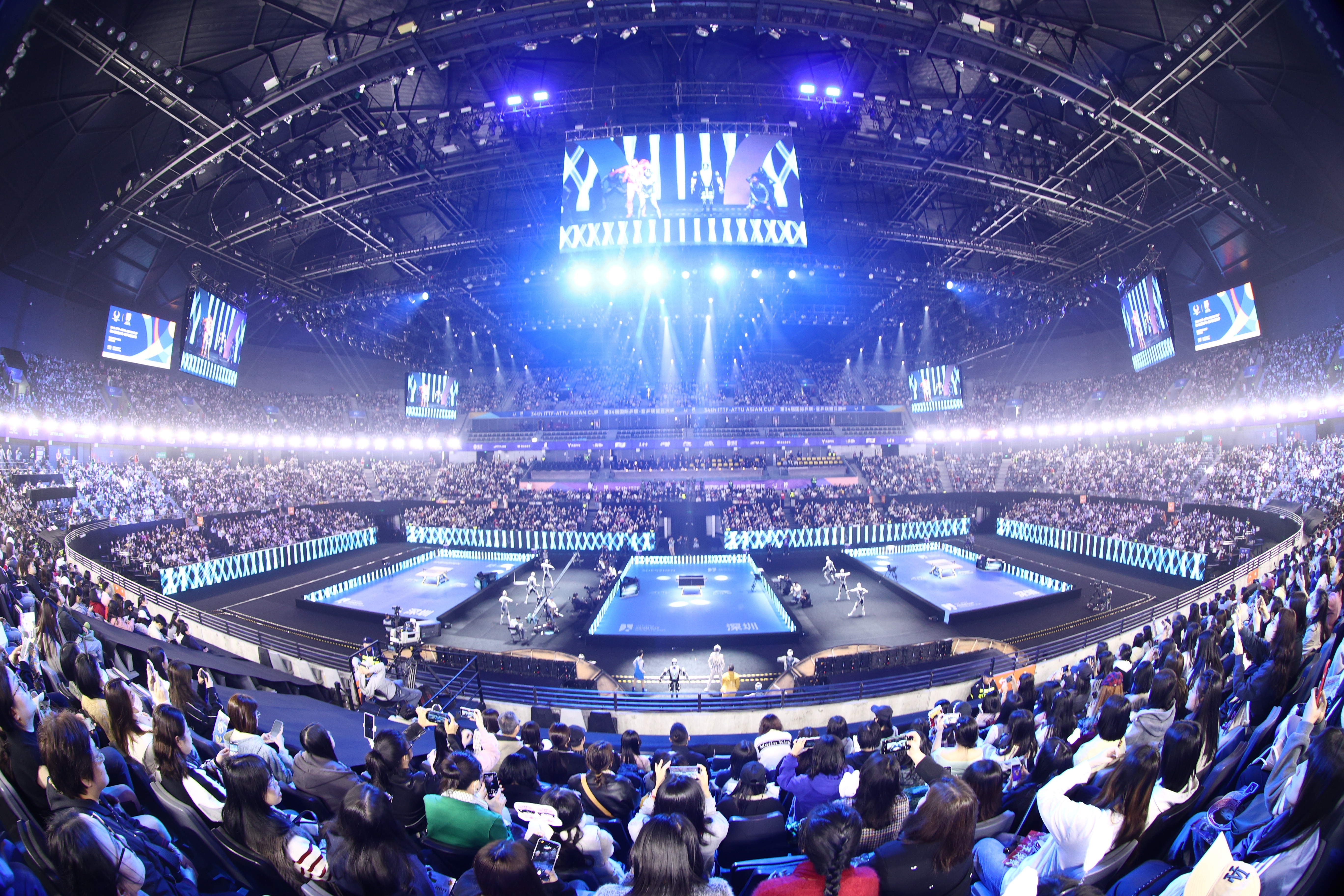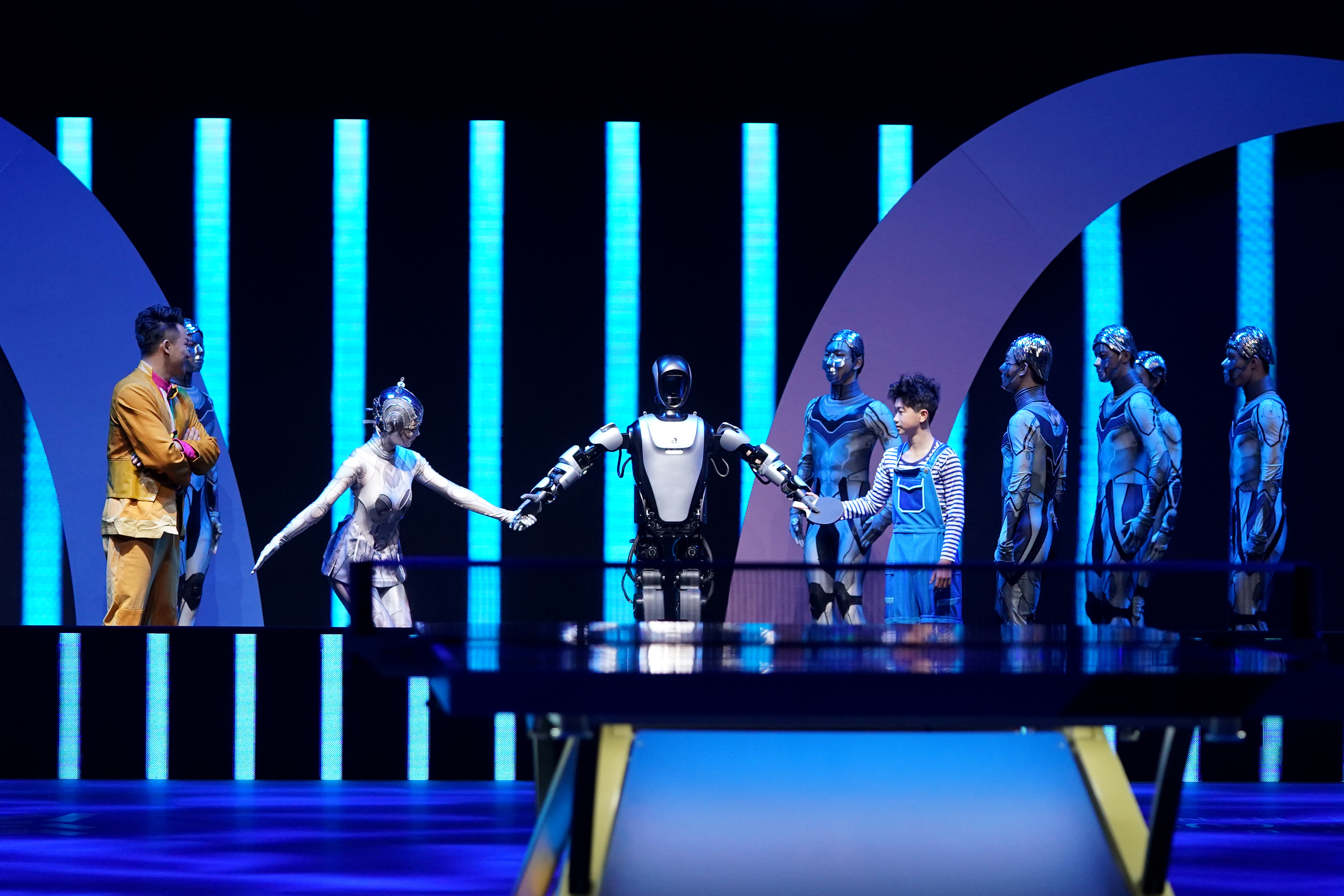 舞台上,中国首部人工智能题材舞剧 《深AI乒乓》迎来首秀,机器人与舞者携手演绎乒乓球主题,体育与科技在此交汇。在吉祥物“朋朋”的带领下,深圳大运中心体育馆再一次响起热烈的掌声和欢呼声。