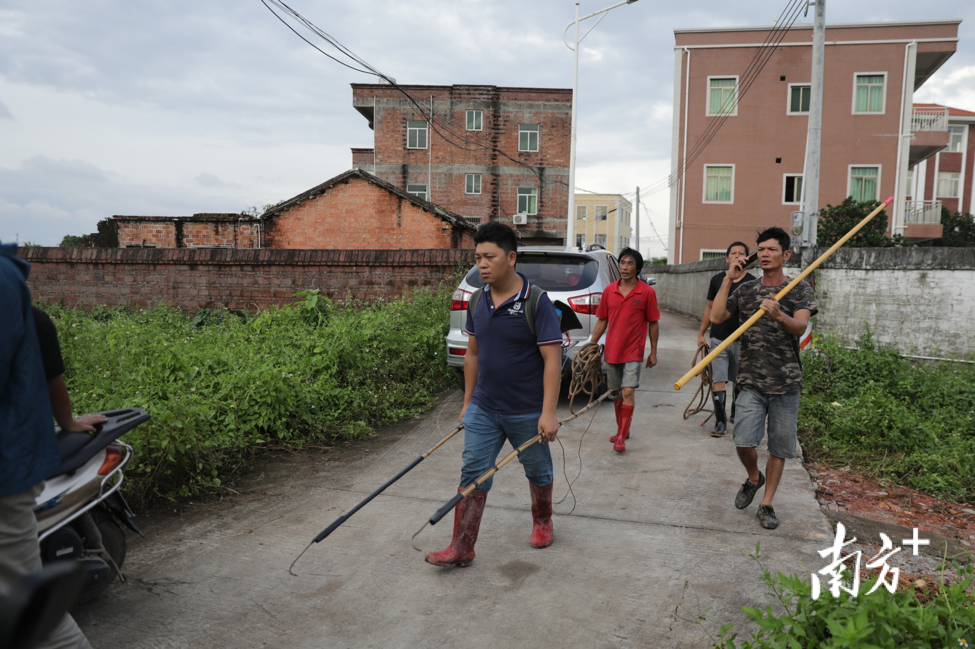 15日18时许,记者在村内看到村民们或骑车帮忙运送物品,或拿着捕鱼装备乘车前往可能发现鳄鱼线索的地点。