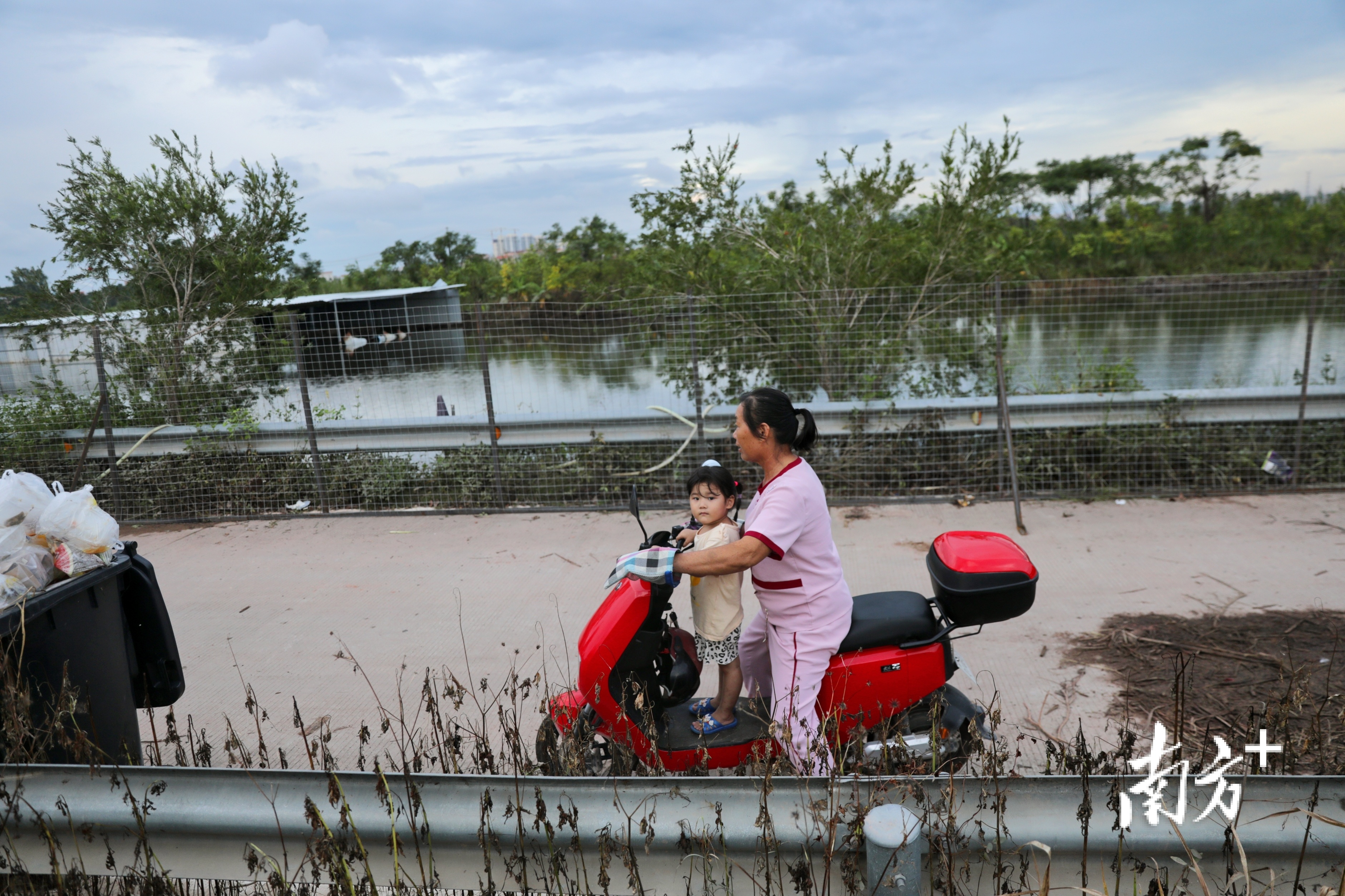 天色渐暗,雨水骤歇,有居民带着孩子走出家门,在水边缓缓散步而过。