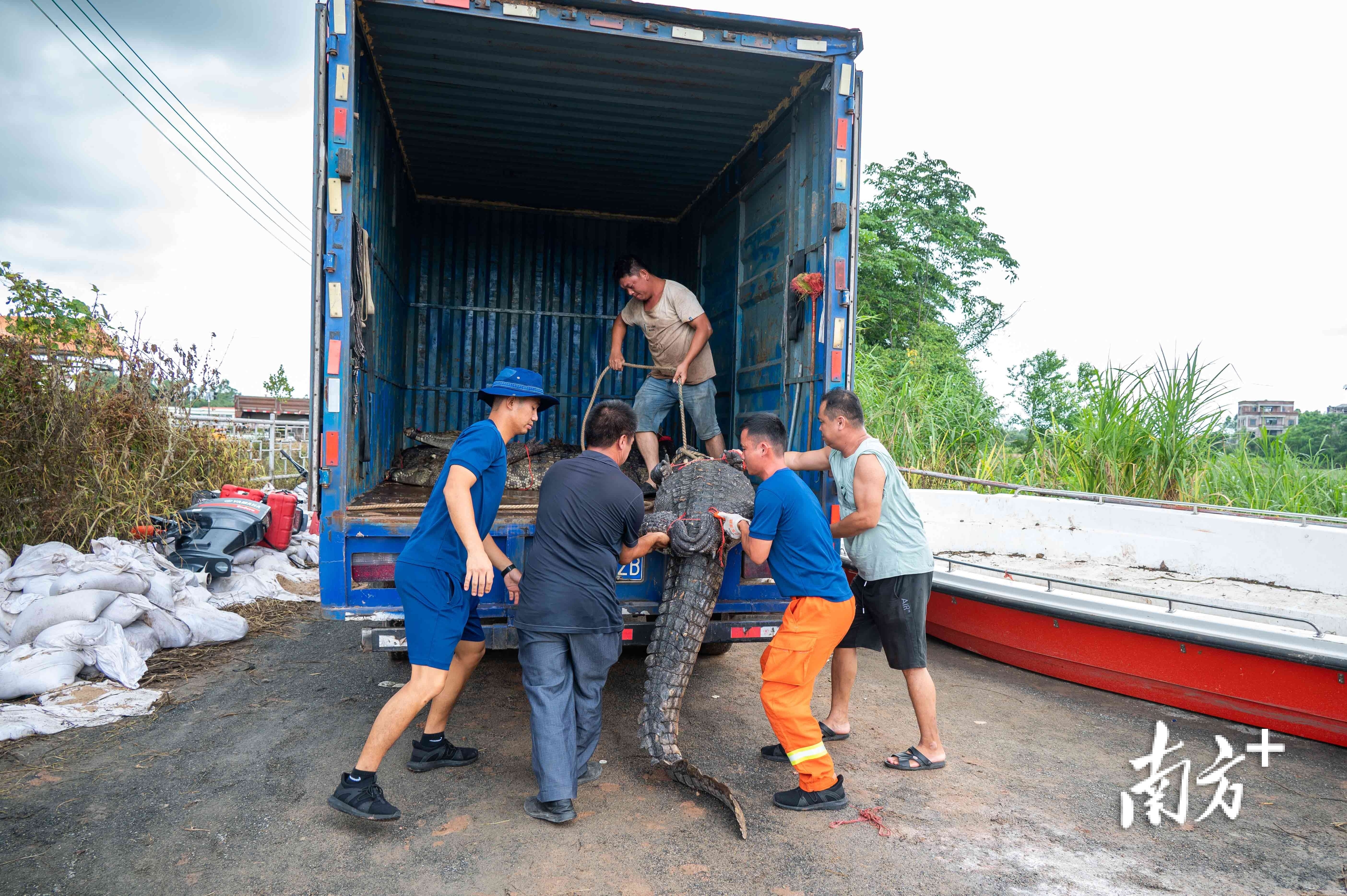 茂名养殖场鳄鱼已抓58条!众人抬鳄鱼运上货车