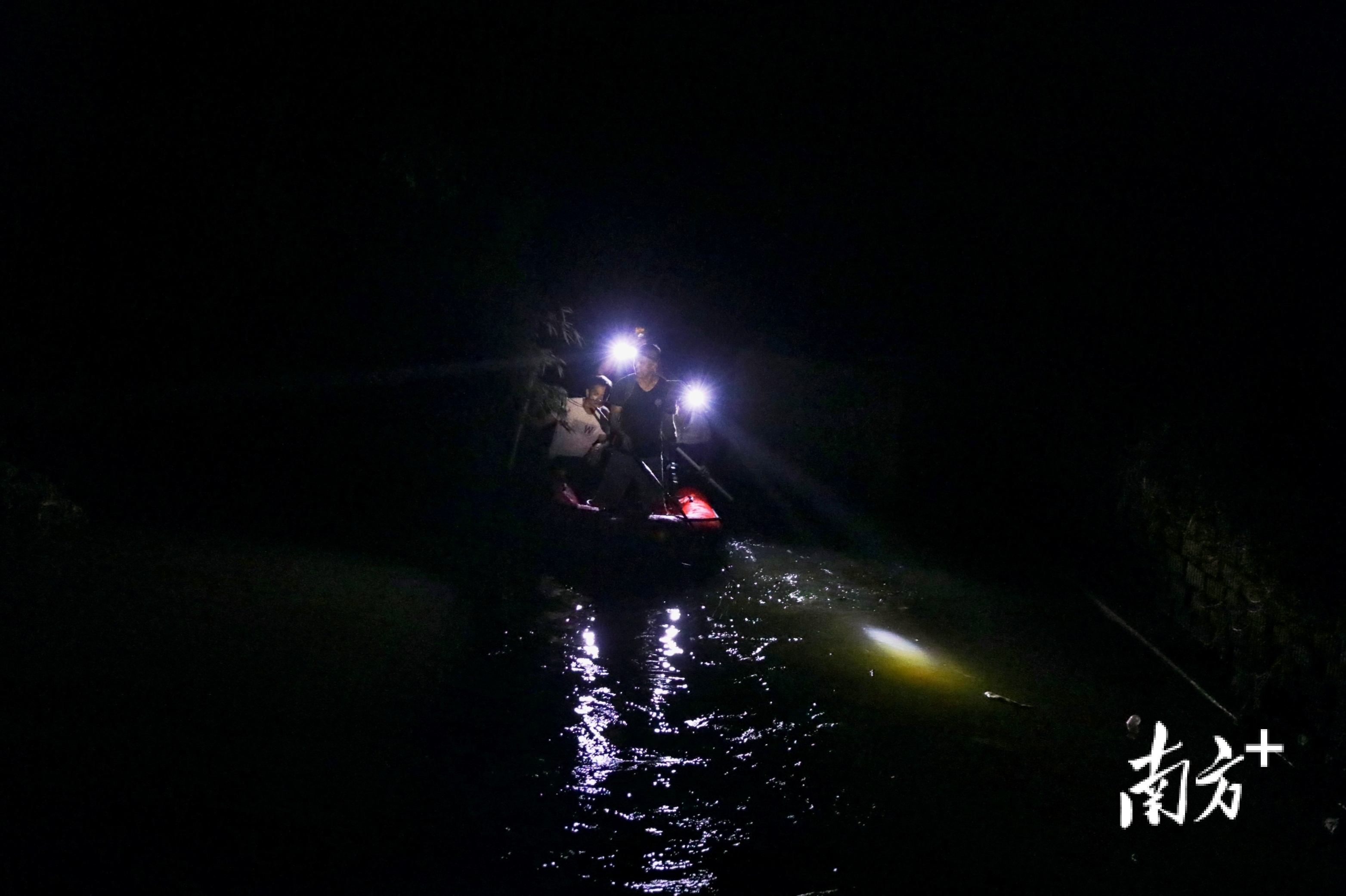 连日来,当地搜索范围不断扩大。19日凌晨2时许,记者跟随前来支援的搜捕队伍,进入彭村湖上游河流展开搜寻。