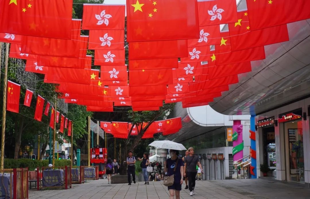 尖沙咀和湾仔街头满眼“中国红”,国旗和区旗在人们头顶高高挂起,组成了一条红色喜庆的“走廊”。市民游客漫步其间,不时有人拍照打卡,氛围感十足。