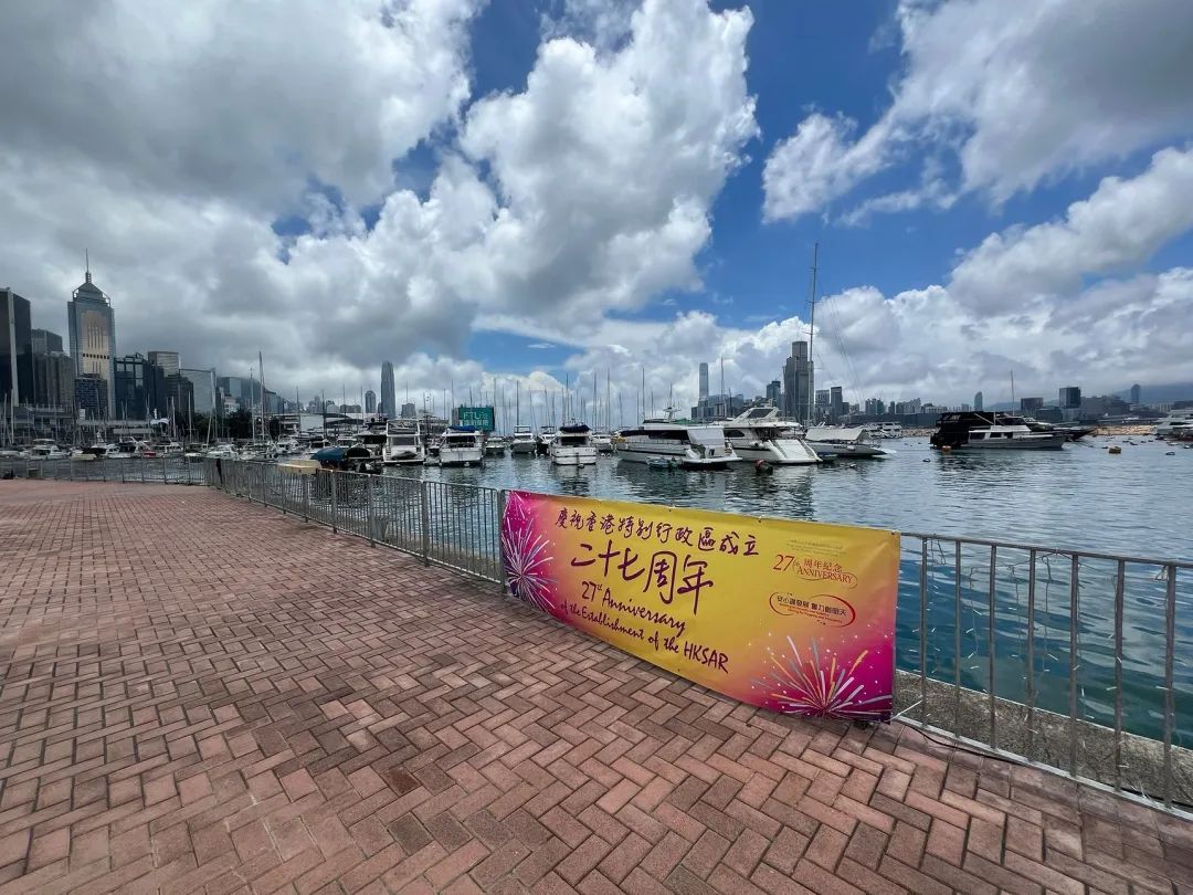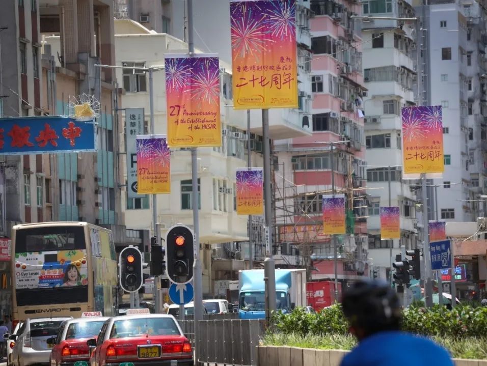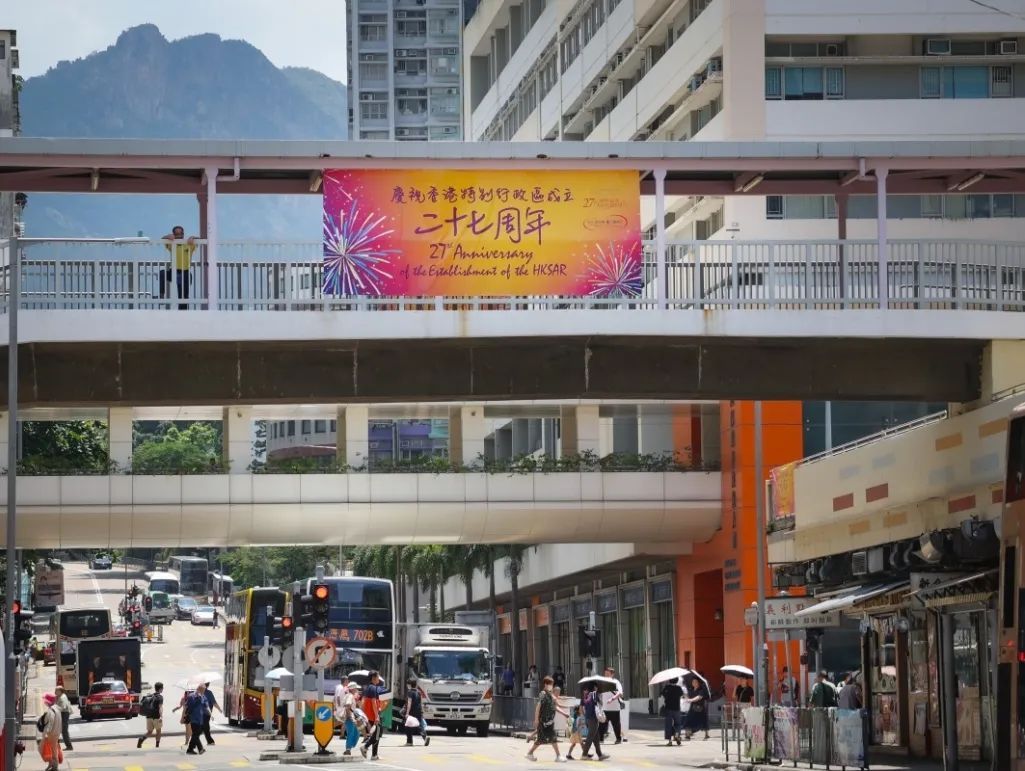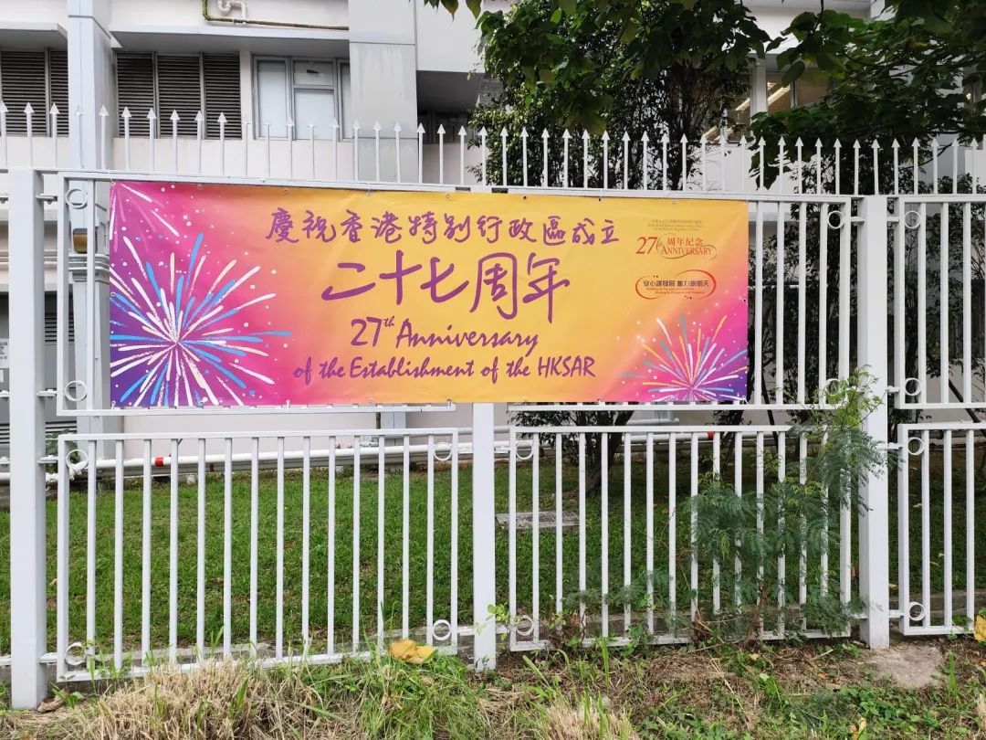 像这样的横幅、海报,在香港各区随处可见,传递着香港回归祖国27周年纪念日将至的喜悦。