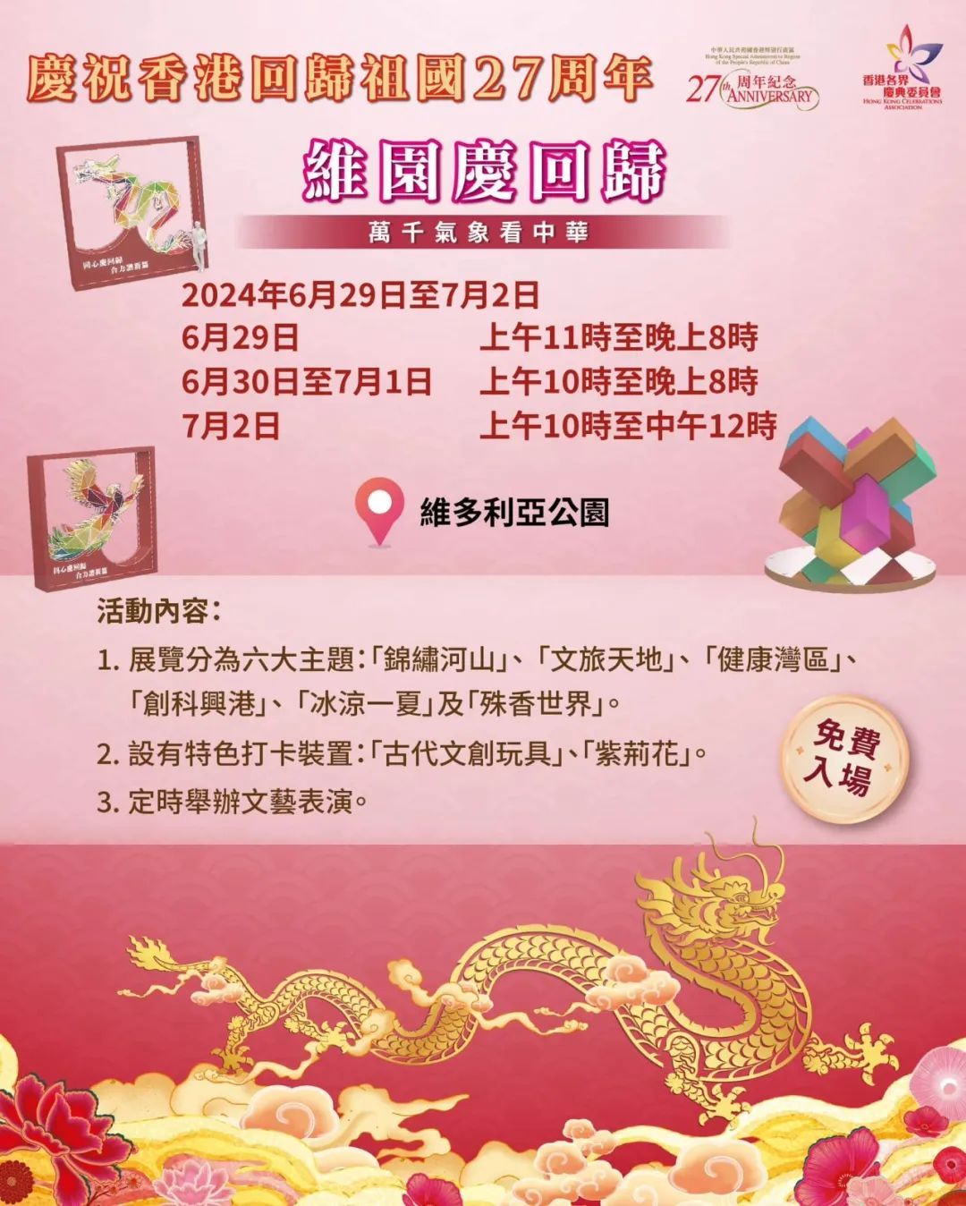 据悉,由香港各界庆典委员会主办的“万千气象看中华”维园庆回归活动,将于今日(6月29日)至7月2日举行,观众免费入场。今次展览包括六大主题,包括“锦绣河山”“文旅天地”“创科兴港”“冰凉一夏”“健康湾区”及“殊香世界”,以各种有趣的方式将中华优秀传统文化呈献给大家。