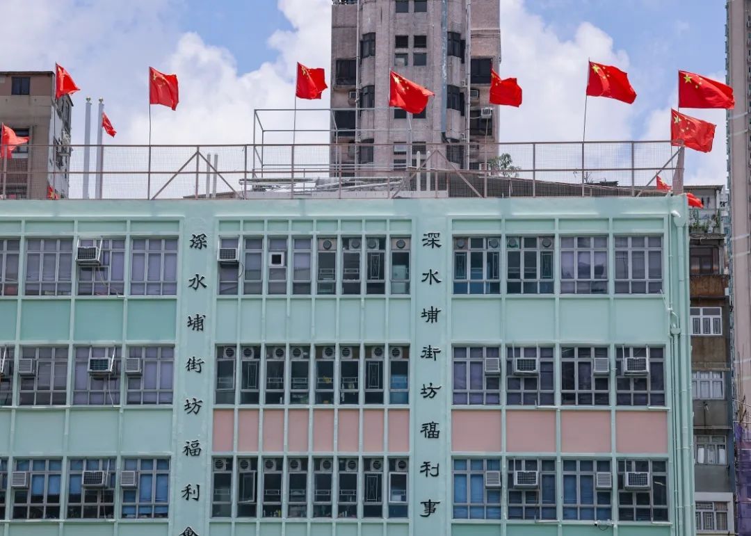 在深水埗的一栋大楼楼顶,鲜艳的五星红旗高高飘扬,为这个传统社区增添了一抹暖色。