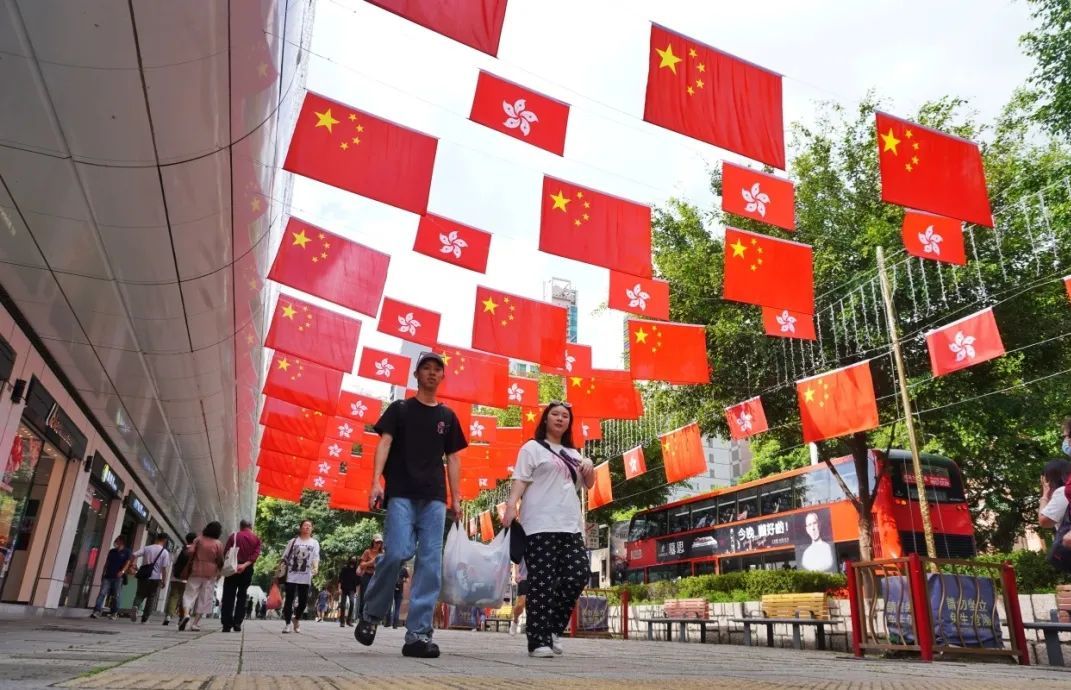 随着香港回归祖国27周年纪念日临近,香港街头庆祝气氛日渐浓厚。连日来,香港各区装饰一新。