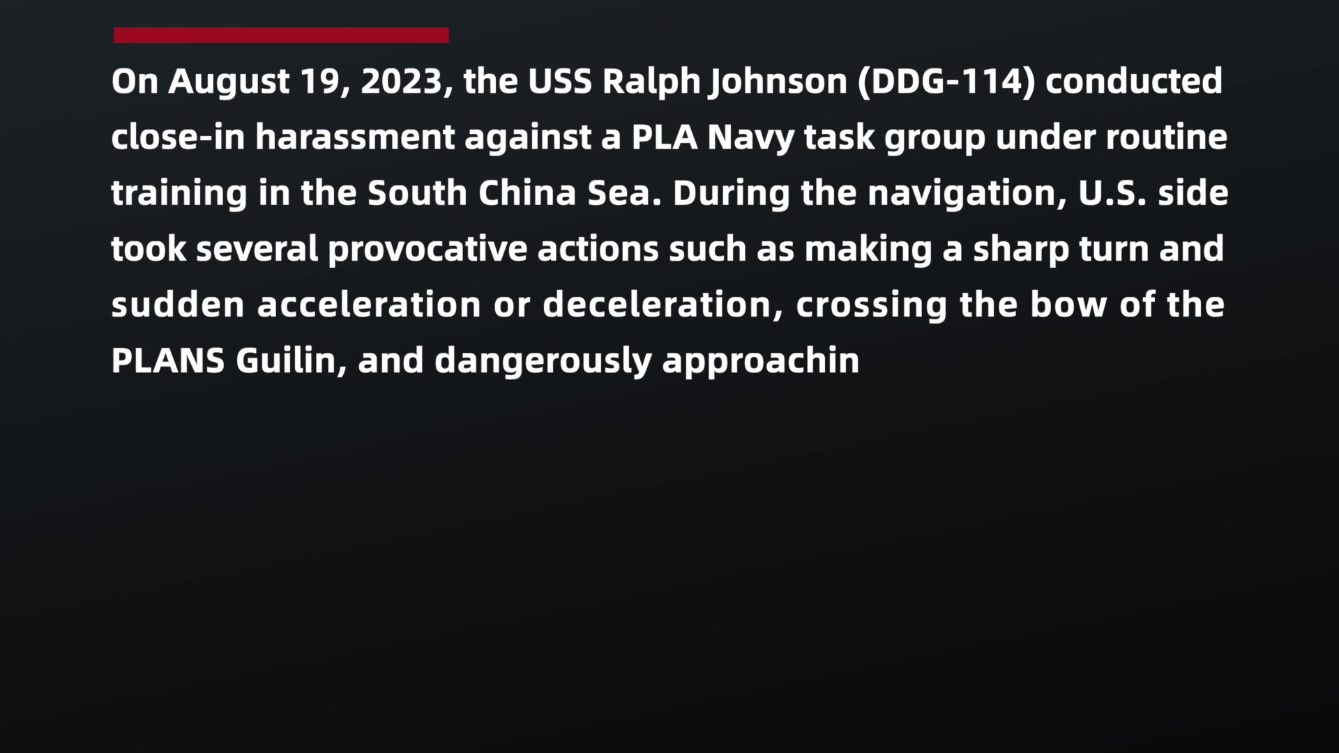 这个视频表明,美方才是真正的挑衅者、冒险者、搅局者。类似的视频我们还有很多,今天出于时间关系就不一一展示了。在此,我强调一点,要高度关注事情发生的地点,中美舰机近距离接触的地点均是在中国周边海空域,它不是发生在墨西哥湾,也不是在美国西海岸,而是美方跑到中国家门口来挑衅滋事。你若不来,我能拦你?美方想一边危害中国的国家安全,一边不受约束地挑衅滋扰,这是不可能完成的任务。中国军队始终保持高度戒备,将采取一切必要措施,坚决捍卫国家主权安全和海洋权益。