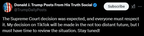 特朗普此前曾表示,考虑在上任后发布行政命令,暂停执行TikTok销售或禁止法60至90天。