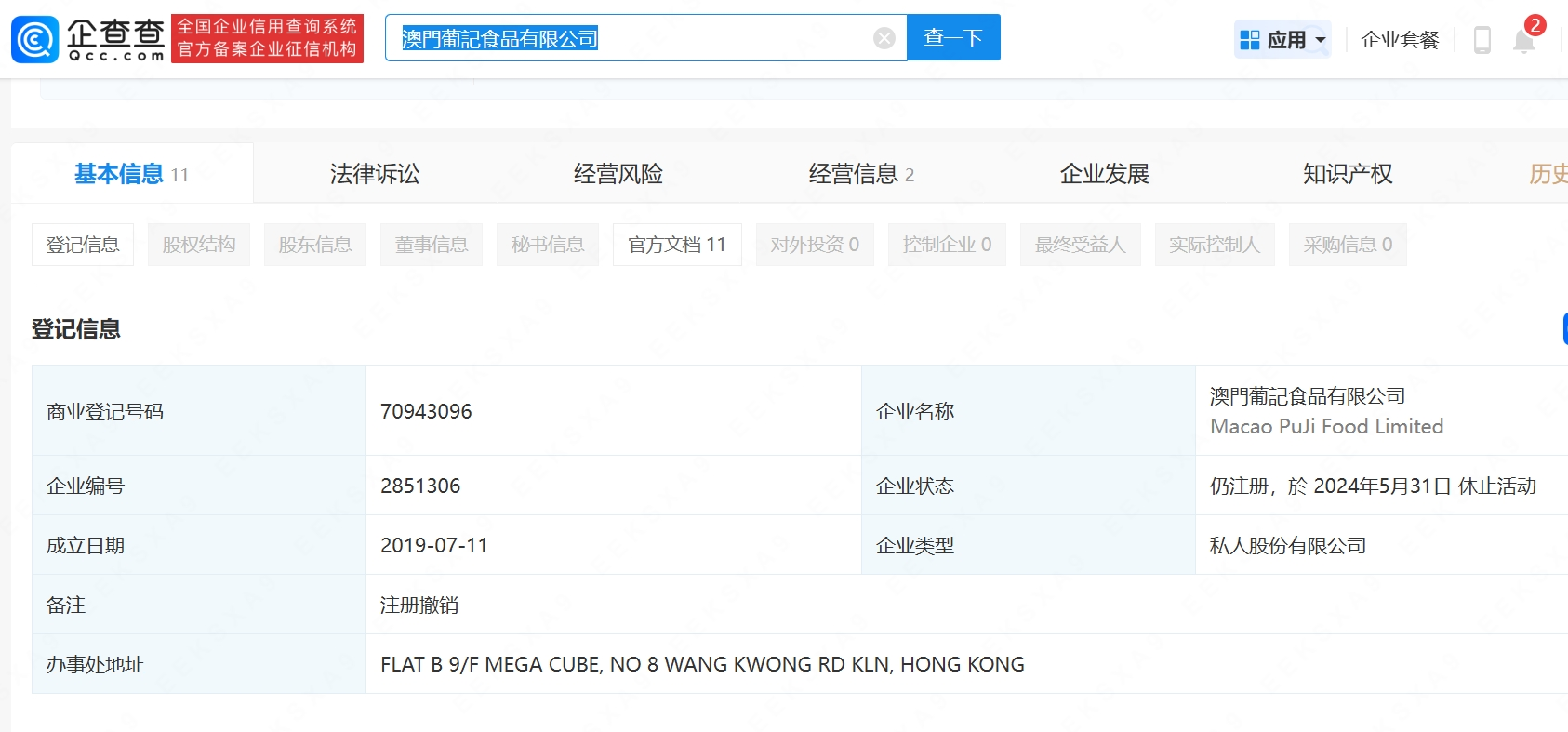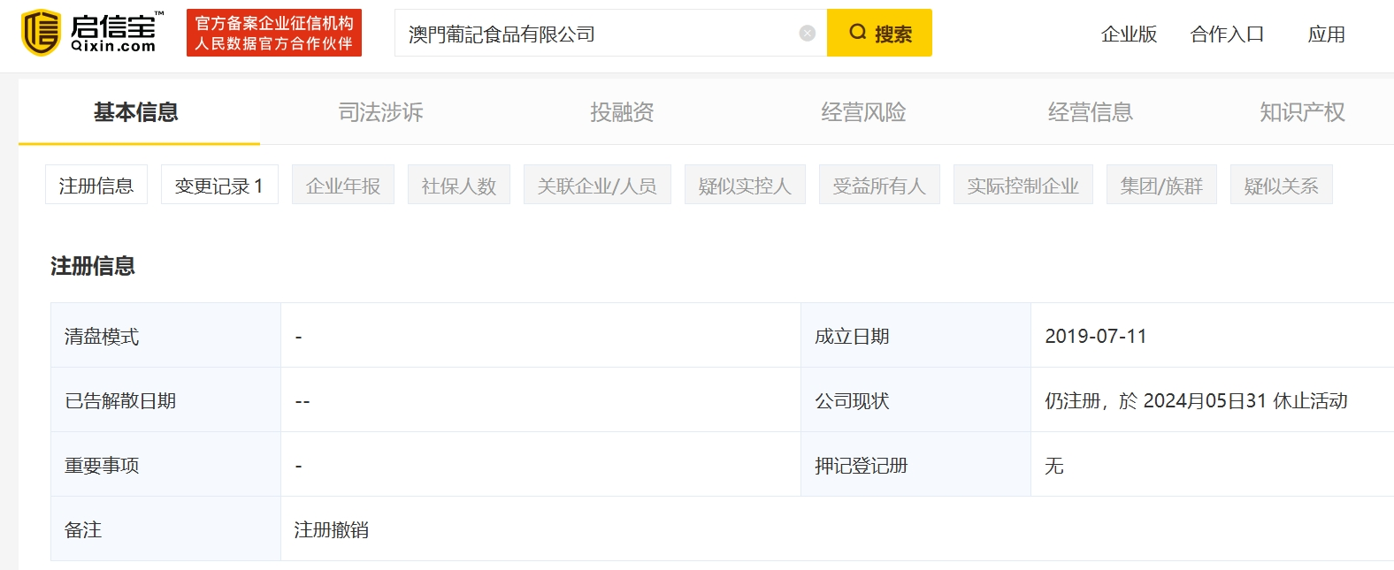 但是值得留意的是,根据企查查和启信宝等平台的数据显示,“澳门葡记食品有限公司”注册地为香港,其状态虽然是“仍注册”,但是不仅已经“注册撤销”,而且已经于2024年5月31日申请处于“休止活动”状态。根据《香港公司条例》第327A条,公司可以通过特别决议决定进行休止活动,但是休止活动的条件之一,就是“公司无法继续经营或暂时停止运营。”