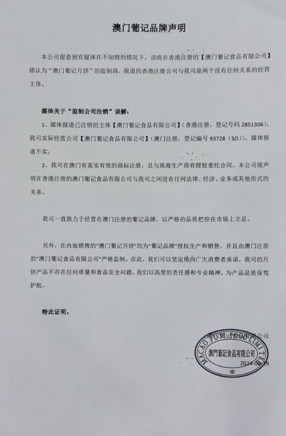 澳门注册企业“澳门葡记食品有限公司”表示,在内地销售的“澳门葡记月饼”均为“葡记品牌”授权生产和销售,并且由澳门注册的“澳门葡记食品有限公司”严格监制,并向广大消费者承诺,其月饼产品不存在任何质量和食品安全问题。