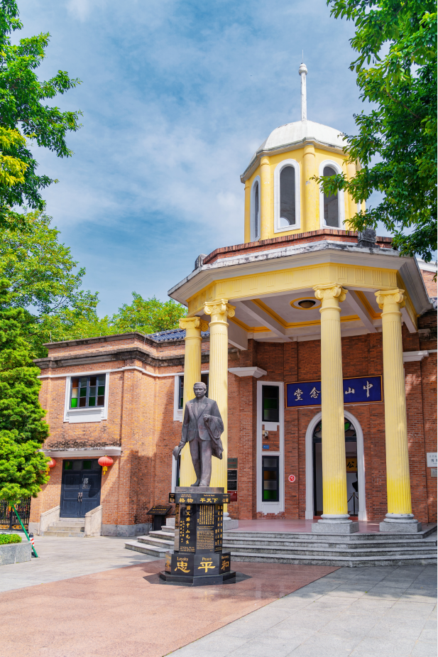 江门中山纪念堂是江门市为纪念辛亥革命和孙中山先生,于1927年兴建,1930年元旦落成,随后经过三次修葺并于2011年7月22日修缮落成并正式对外免费开放。现建筑占地面积950平方米,由放影室、戏台、化妆间及观众坐席等组成,顶部原为工字钢梁结构,1950年重修后改为钢筋水泥结构。2012年5月28日,在江门中山纪念堂前隆重举行了孙中山先生铜像揭幕仪式。