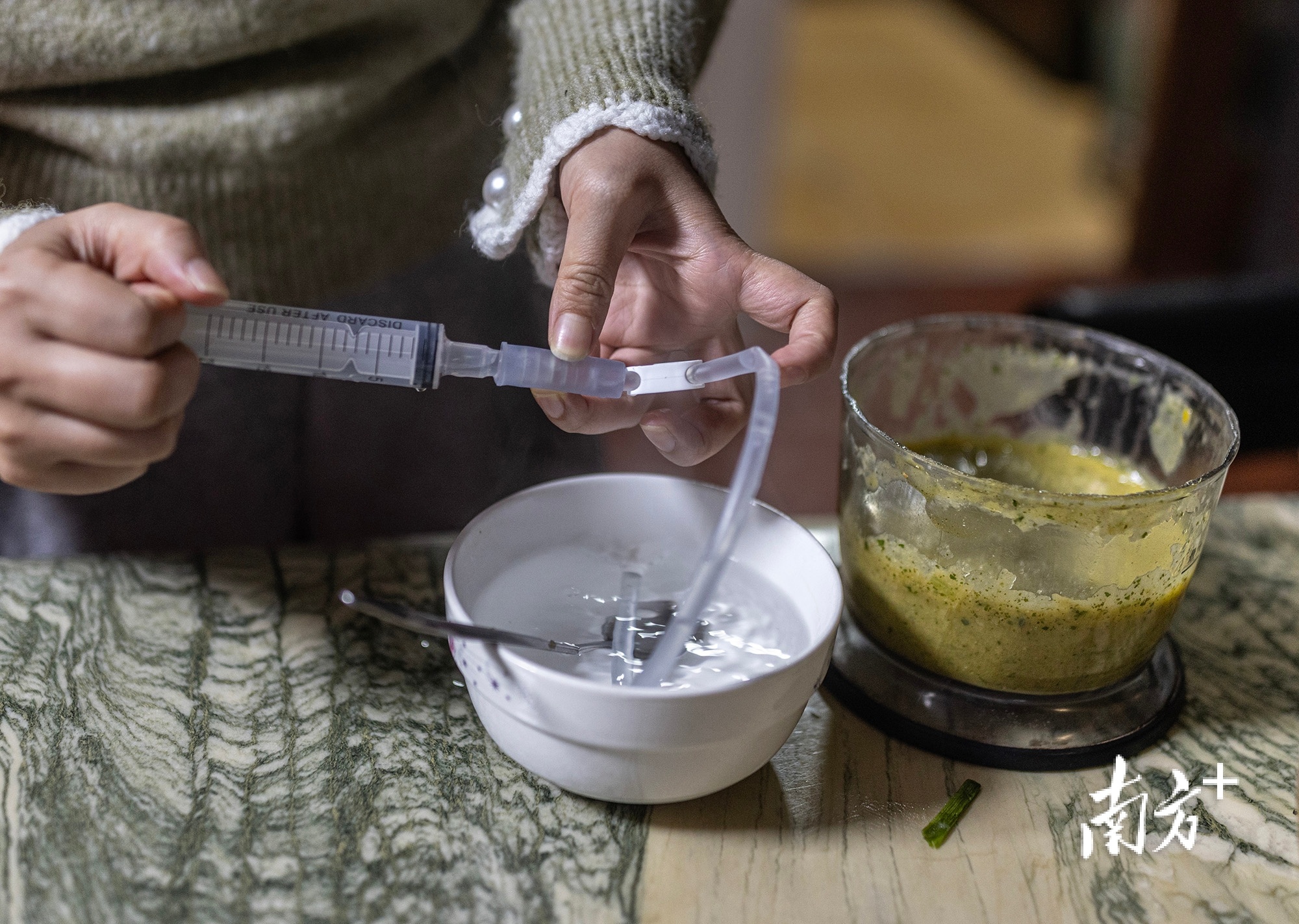 1月30日晚上,杜佳通过胃管给小“米粒”注食。