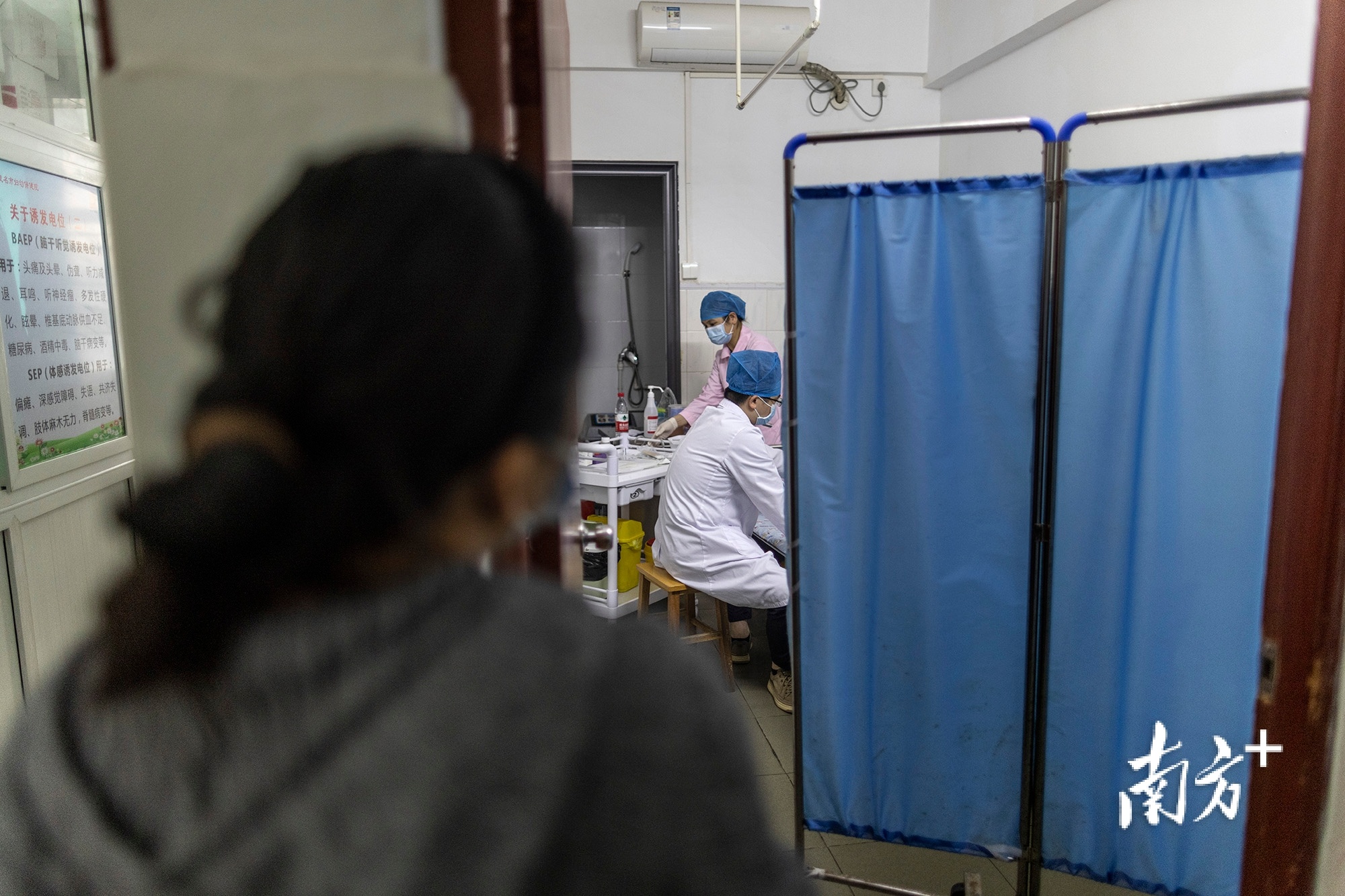 医护人员正在为小“米粒”进行鞘注,杜佳紧张地在病房外观望。