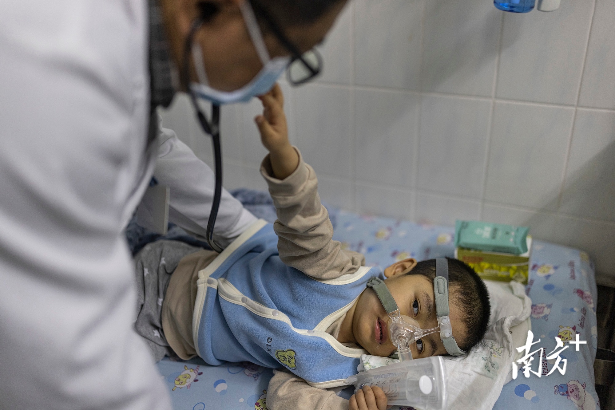 医生前来做检查,小“米粒”调皮地想要抓他的眼镜。