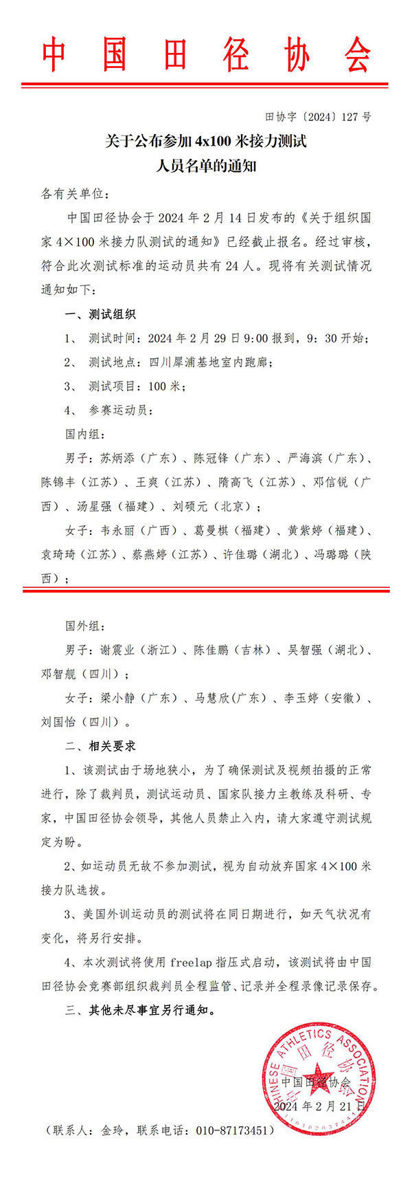 根据中国田径协会发布的《关于公布参加4×100米接力测试人员名单的通知》,苏炳添出现在国内组名单中,其广东队队友陈冠锋、严海滨同样在国内组名单中,测试地点为四川成都的犀浦基地。