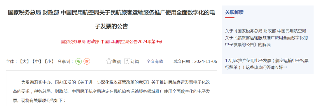 此前,为便利旅客无纸化出行,国家税务总局、财政部、中国民用航空局联合发布《关于民航旅客运输服务推广使用全面数字化的电子发票的公告》,2024年12月1日起,民航境内旅客运输服务全面推广使用电子行程单,设置过渡期至2025年9月30日,并明确了旅客获取电子行程单以及单位查询查验电子行程单的渠道,同时,单位可按照电子凭证会计数据标准进行验签。