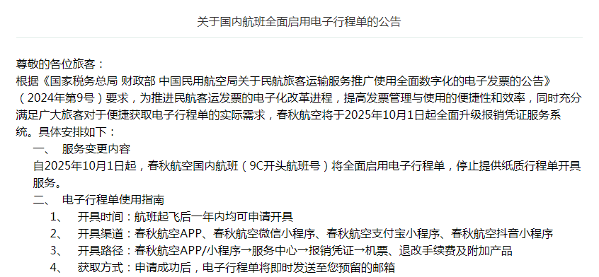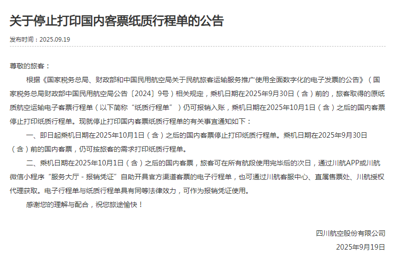 航司相关公告显示,即日起乘机日期在2025年10月1日(含)之后的国内客票停止打印纸质行程单。乘机日期在2025年9月30日(含)前的国内客票,仍可按旅客的需求打印纸质行程单。