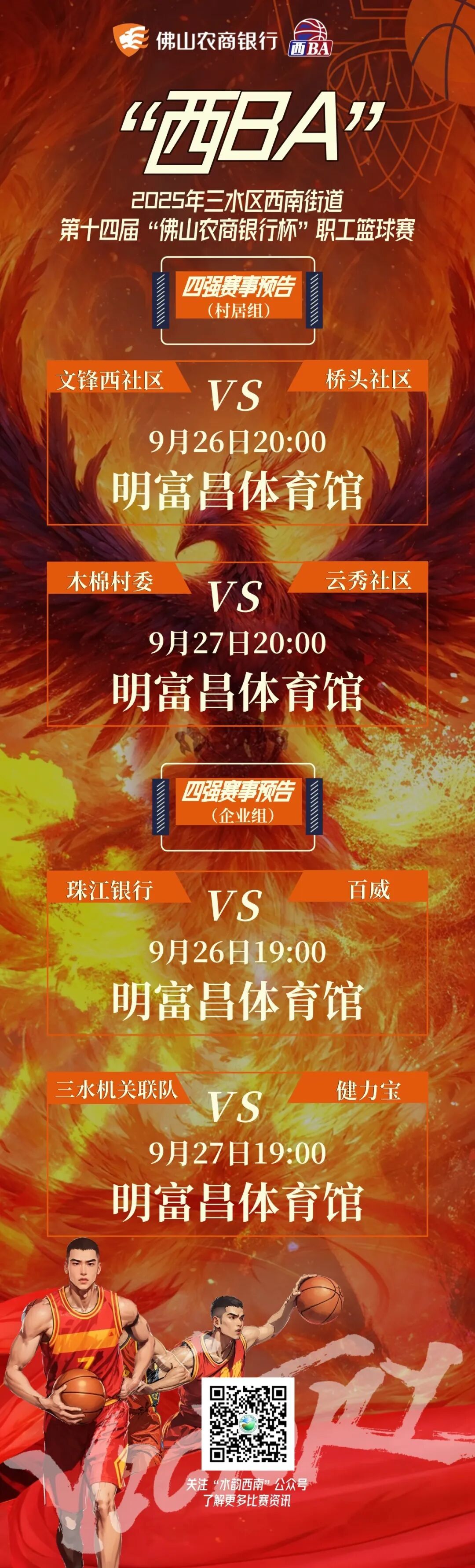 巅峰对决即将来袭!2025年9月26、27日,明富昌体育场将迎来四强争霸战,村居豪强与企业劲旅将为出线名额展开终极较量。是木棉村委延续黑马姿态,还是云秀社区保持三分火力?是三水机关联队持续强势,还是健力宝队再续传奇?延续十四载的篮球传奇,又将书写怎样的热血新篇?让我们共同期待!