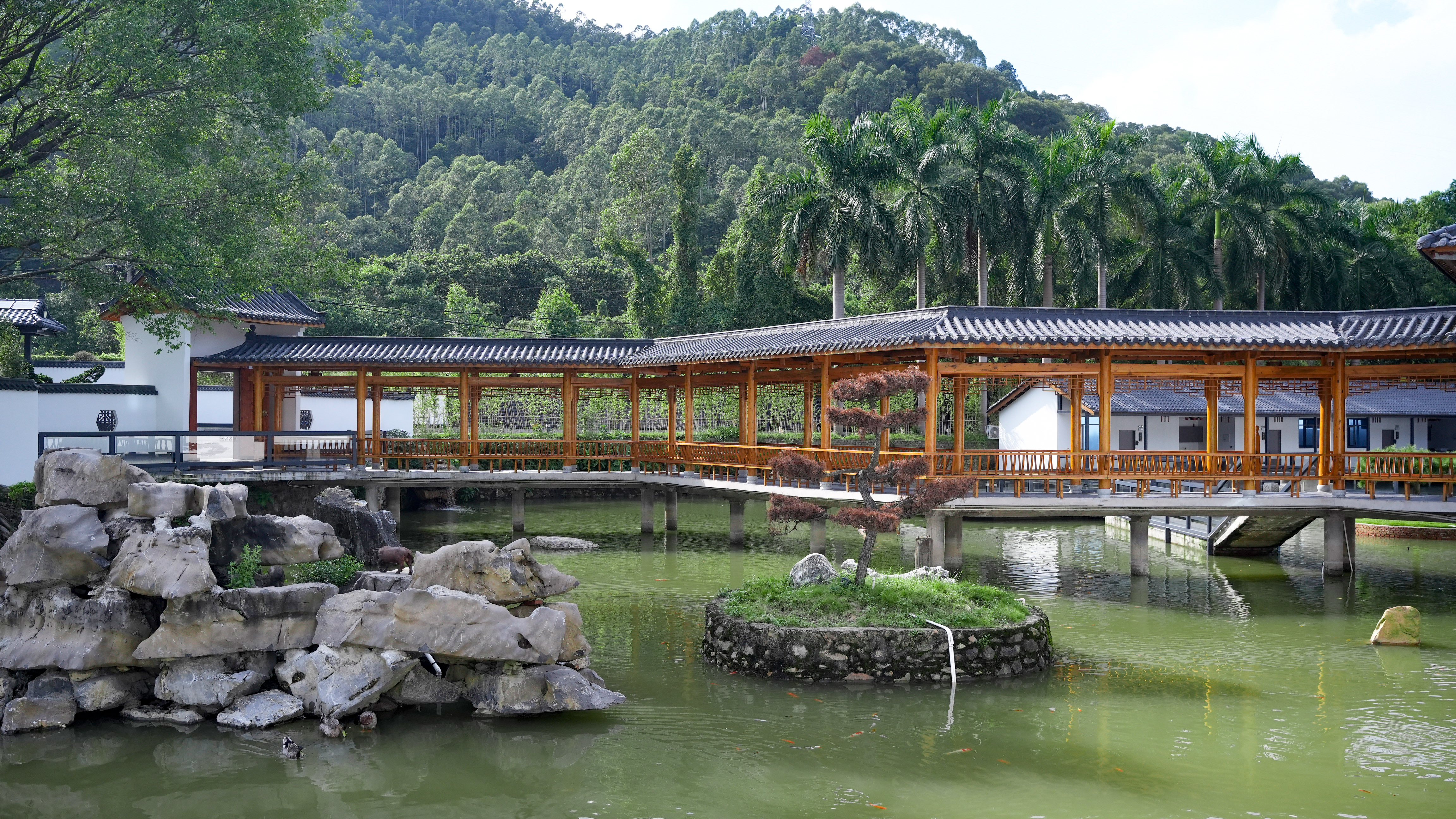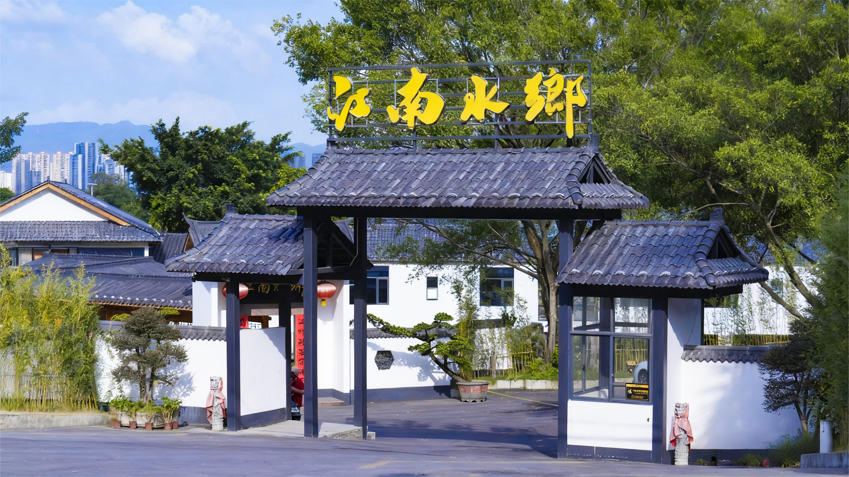民宿坐落于贞山旅游度假区内、贞山街道越秀基地旁,依托贞山厚重历史资源与优越自然环境,25.5亩区域沿河铺展而建。其移植江南水乡风韵,创新吸引点——将四会本土特色文化与江南韵味相融,23个房间尽显江南风格。漫步庭院,白墙黛瓦错落,风雨连廊静谧,让人褪去都市喧嚣,感受岭南庭院韵味;连廊至厅落、大厅至客房一步一景,建筑构件暗藏巧思,排水防潮设计与古朴风貌相融,别具历史感。