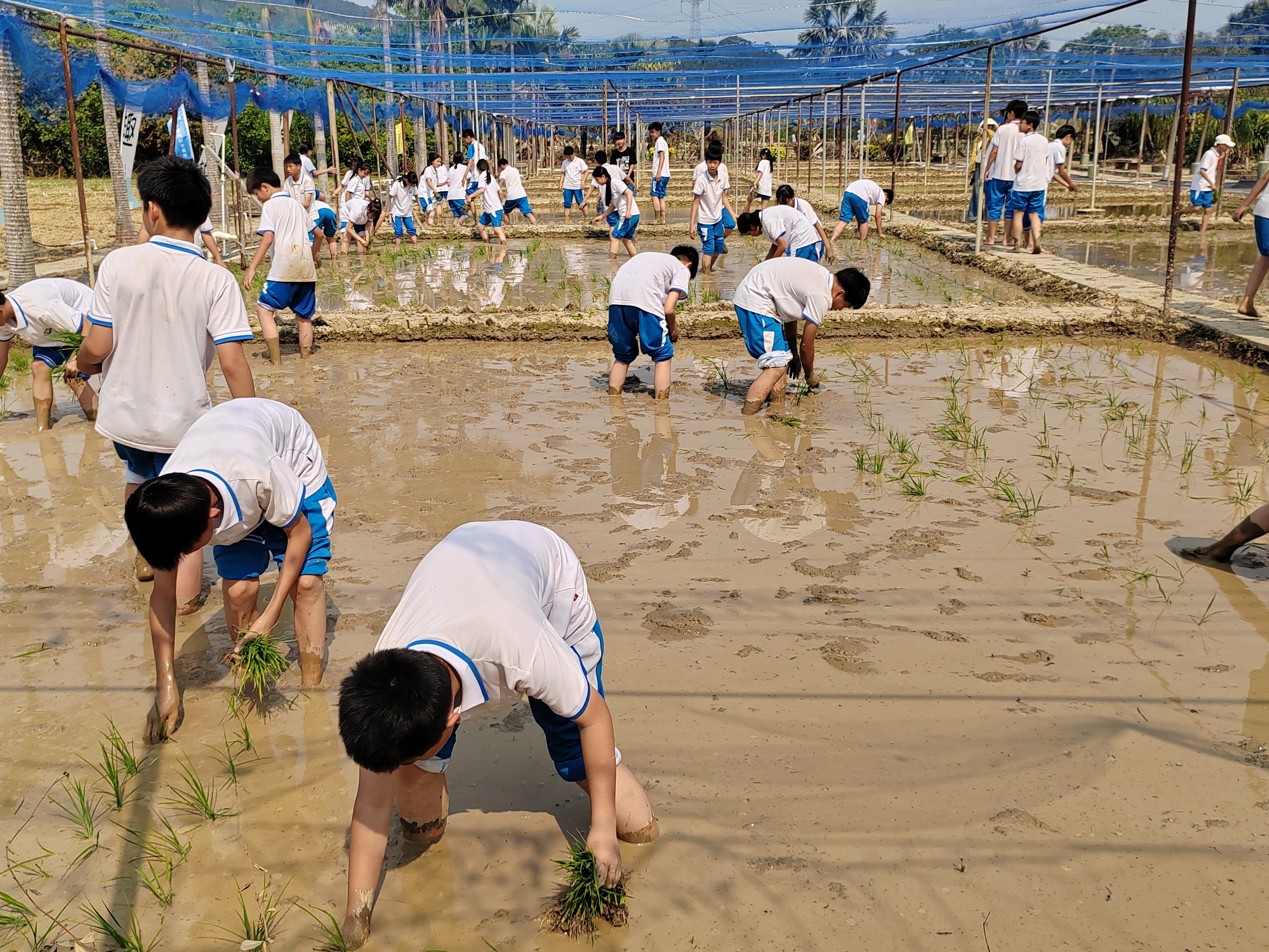2025年4月2日,肇庆高新区南山田园南药科研基地开展研学活动。图为学生体验插秧。郎鹏翔 摄