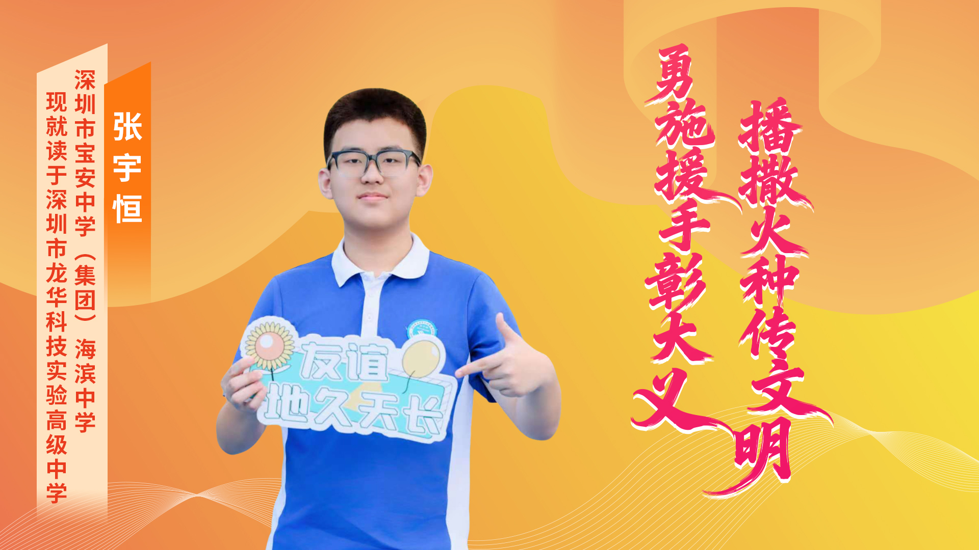 张宇恒,男,现为深圳市龙华科技实验高级中学高一学生。他勤奋好学,长期位居校图书馆借阅榜前三,曾获校级“阅读悦美·共沐书香”名著阅读大赛一等奖;他热心公益,积极参与急救培训、社区服务等志愿活动,荣获学校“2024年度海滨好少年”称号。其勇救昏迷老人事迹被央视新闻、人民网等20余家媒体报道,全网点击量超百万,引发社会广泛赞誉。2025年入选广东“新时代好少年”先进事迹发布名单。