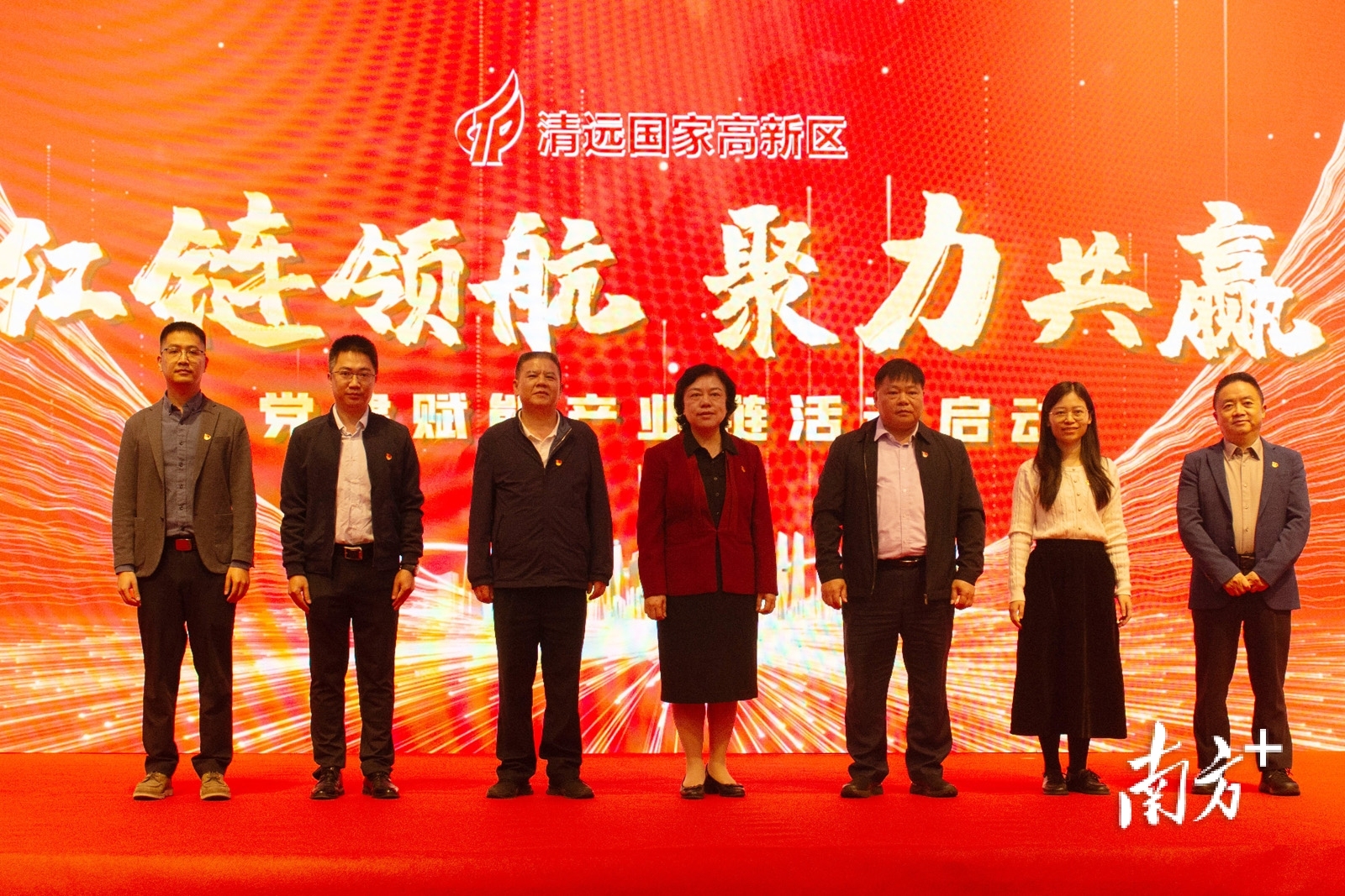 12月19日上午,“红链领航 聚力共赢”——党建赋能产业链活动启动仪式在清远高新区天安智谷国际会展中心举行。图为上台宣布活动启动的与会领导合影。陈伟毅 摄
