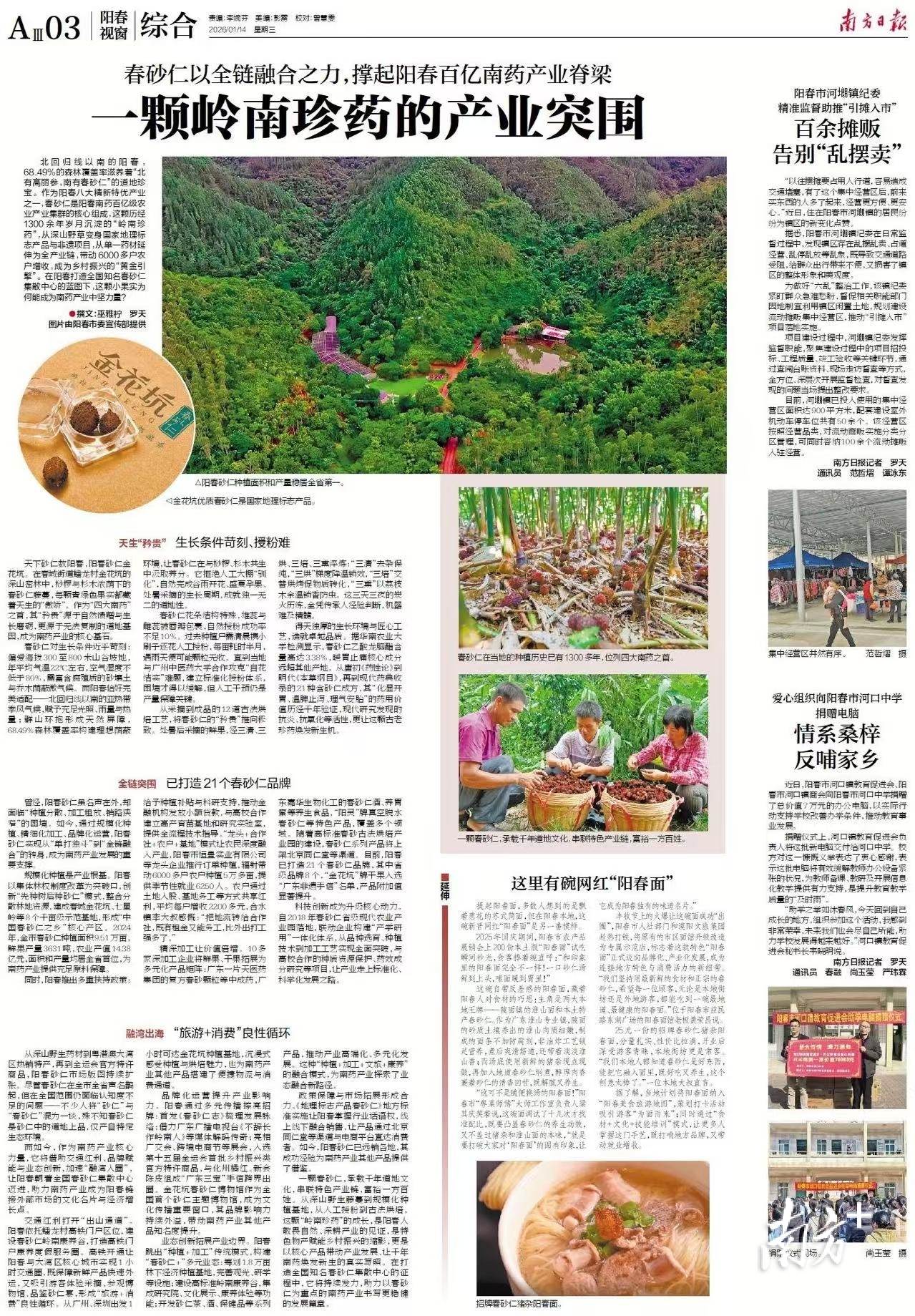 政策保障与市场拓展形成合力。《地理标志产品春砂仁》地方标准实施让阳春掌握行业话语权,线上线下融合销售,让产品通过北京同仁堂等渠道与电商平台直达消费者。如今,阳春砂仁已远销各地,其成功经验为南药产业其他产品提供了借鉴。