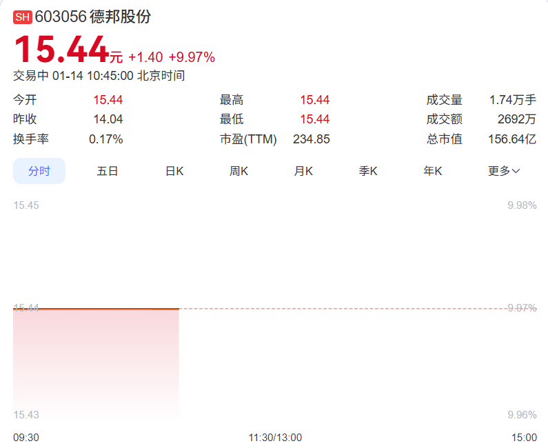 据悉,德邦终止上市后,公司的资产、人员、业务将不会受到不利影响,仍保持独立的品牌及运营。德邦股份将充分地协同京东物流体系的业务资源。1月14日,德邦股份以一字涨停开盘,最新股价为15.44元/股,涨近10%,对应市值为156.6亿元。