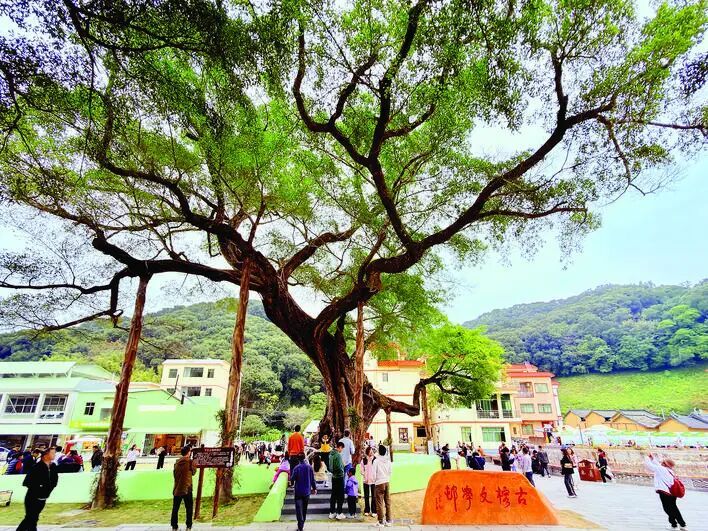 古树是乡村的根与魂。麻榨镇党委副书记卞晓天介绍,为守护这棵千年古榕,麻榨镇开展专业健康监测、加固复壮,让“活化石”永葆生机。目前,以古榕树为圆心,中心村已完成208栋房屋外立面修缮,升级道路、亮化、河道景观,村容村貌焕然一新。引进的古榕文学村项目中,粮仓书局、文学咖啡、树洞酒馆等主题空间次第开放,东坡茶室、文学迷宫等沉浸式场景,让抽象文脉变成可触摸、可体验的乡村美景,把“过路客”变成“留村客”,让千年文脉在新时代焕发新生。