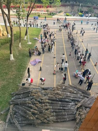 约10车、共计3万根新鲜甘蔗抵达广东外语外贸大学两校区,发放现场人头攒动,每个人手上都杵着长棍般的甘蔗,被网友戏称为“武林大会现场”;