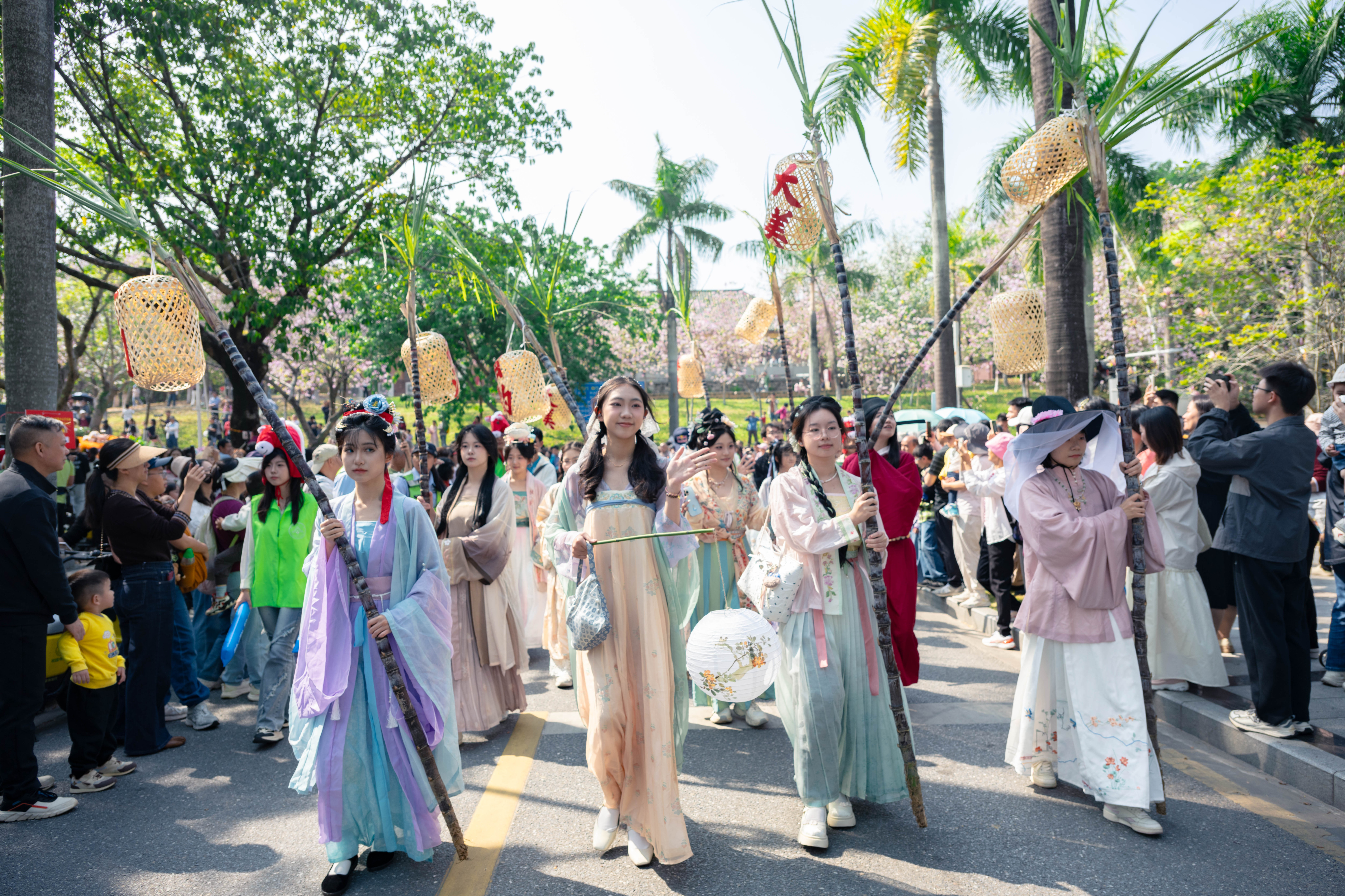 华南农业大学近日举办紫荆科技文化节,学生们身穿汉服,手执南沙黑皮果蔗,并在蔗头上挂竹笼,寓意“揸住碌竹、掂过碌蔗”;在该校承办的“广货行天下·粤牧优品”文明集市促消费活动中,南沙黑皮果蔗火热亮相,5小时内销售量便突破2万斤。