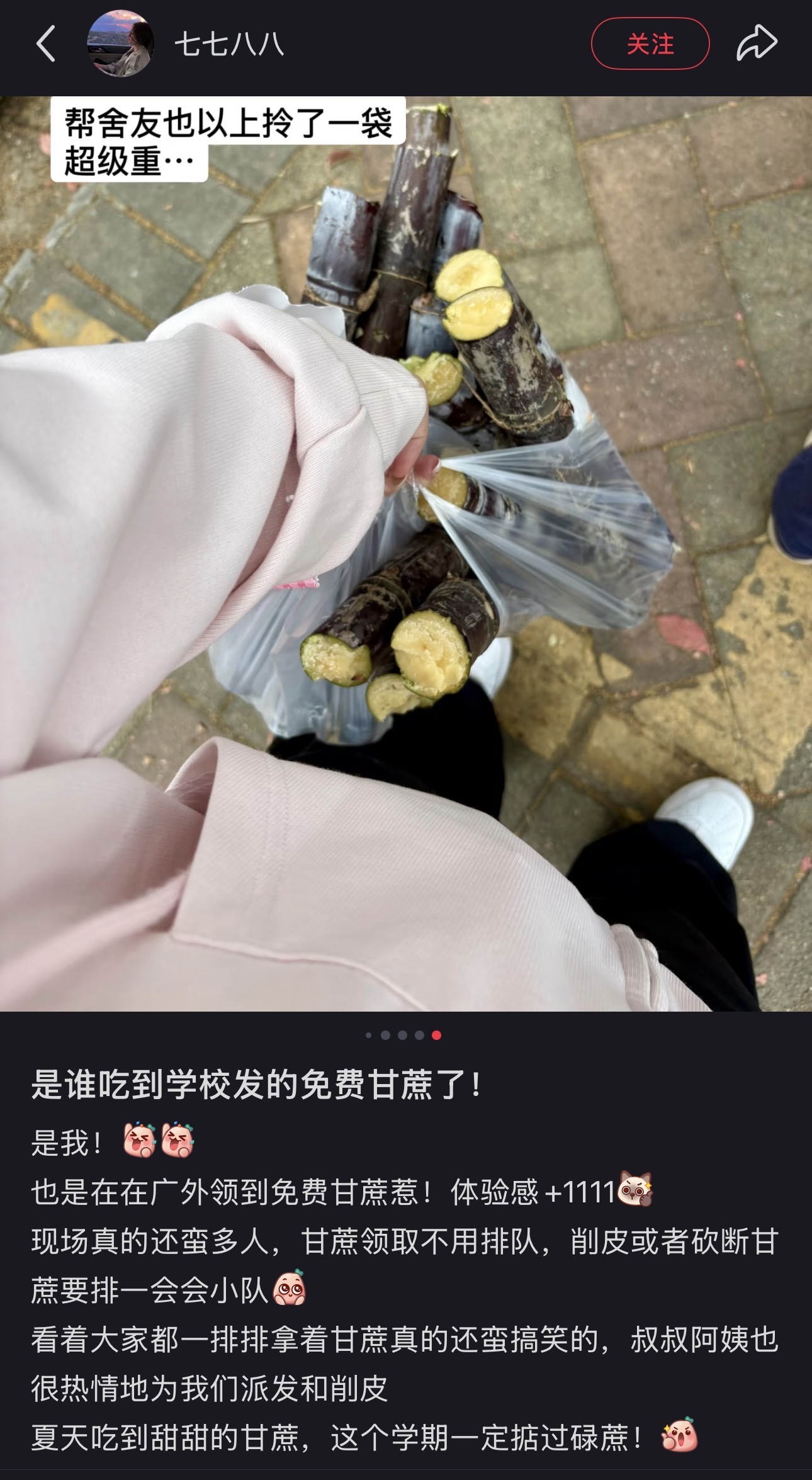 “广外er今天有自己的‘劳动节’。”(领到甘蔗后需要自己削皮)