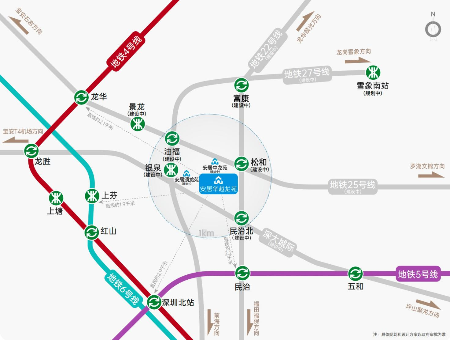 交通规划上,项目周边有4号线龙华站、龙胜站,6号线上芬站, 1公里范围内还将建有22/25/27三条地铁线和深大城际民治北站,未来4公里可直达深圳北站,40 分钟到机场,直通福田、南山核心区和前海。