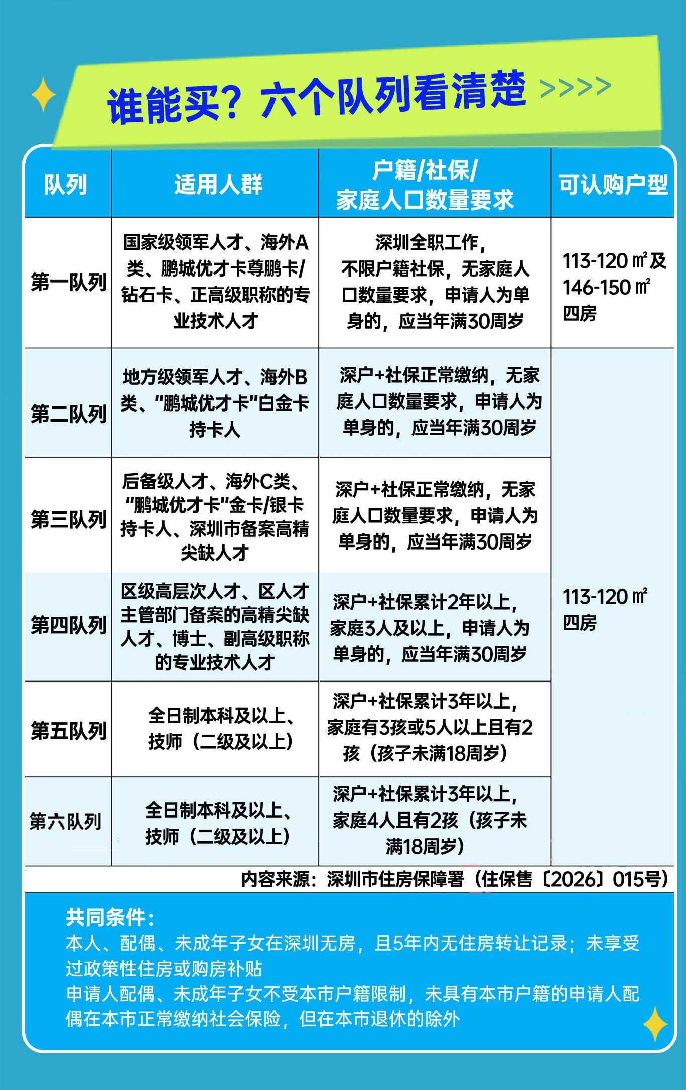 具体到华越龙苑项目,根据深圳市住房保障署的配售通知,申购家庭按人才层次分为六个队列,其中约113-120平方米的四房户型,只要满足“深户+无房”前提,“社保累计2年以上”的博士三口之家,或“累计缴纳社保3年以上”的本科(或二级以上技师)2孩家庭,都可以认购(详见《深圳市住房保障署面向人才配售住房通告(住保售〔2026〕015号)》。