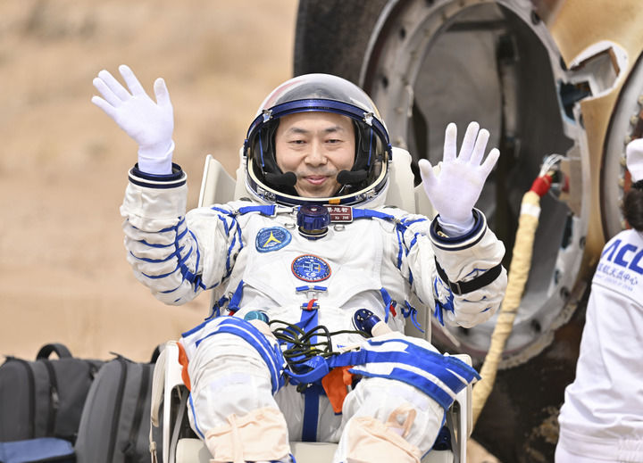 4月30日,神舟十九号载人飞船返回舱在东风着陆场成功着陆,航天员蔡旭哲、宋令东、王浩泽身体状态良好,神舟十九号载人飞行任务取得圆满成功。新华社记者 马金瑞 摄