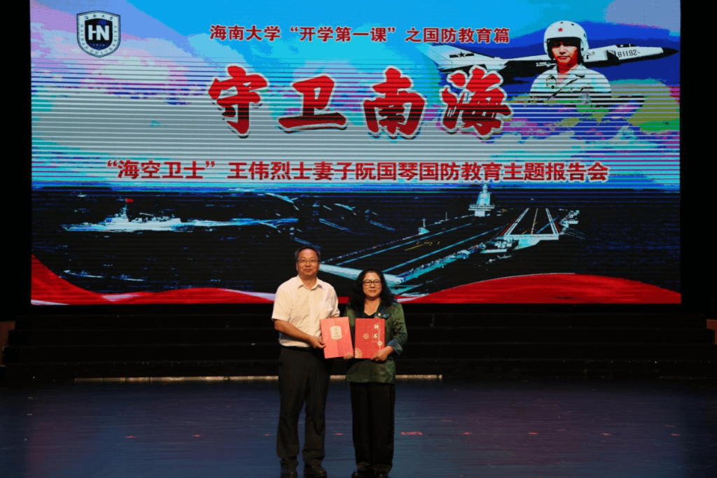 据海南大学官网消息,今年9月8日晚,海南大学在思源学堂大礼堂举行“开学第一课”暨全民国防教育报告会,“海空卫士”王伟烈士妻子阮国琴受邀作国防教育主题报告,近千名师生现场凝神聆听,多次以持久掌声表达崇高敬意。会前,海南大学党委书记李湖在思源大礼堂会客厅会见阮国琴。