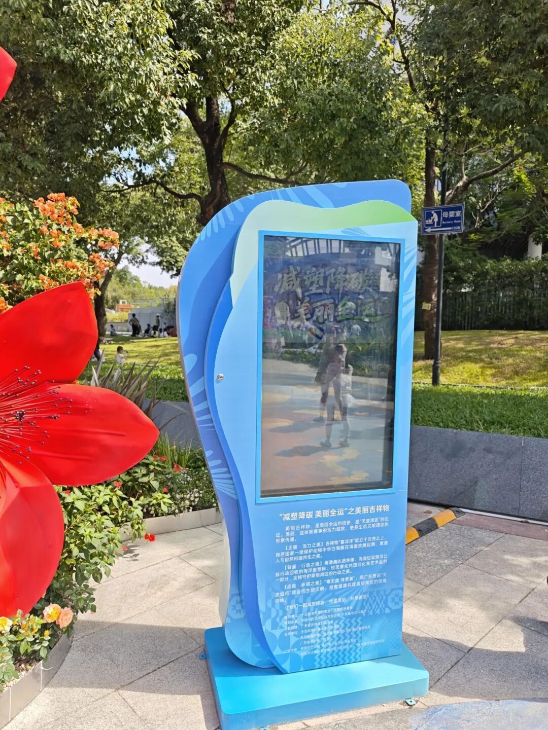 配套的导览柜以“海丝蓝”为主色调,造型融入海浪元素。柜体下部介绍装置内容,上部内嵌43寸电子显示屏,循环播放“减塑降碳,美丽全运”公益活动宣传片等视频图文,具备防雨与夜间播放功能。