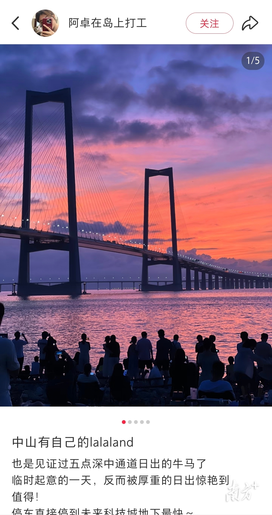 有人说这里像《爱乐之城》——网友“阿卓在岛上打工”晒出深中通道凌晨五点的日出,眼前粉紫交织的日出,瑰丽得宛若梦境,让她想起了电影《爱乐之城》中男女主在夕阳下跳舞的名场面。她写道:“中山有自己的La La Land。”
